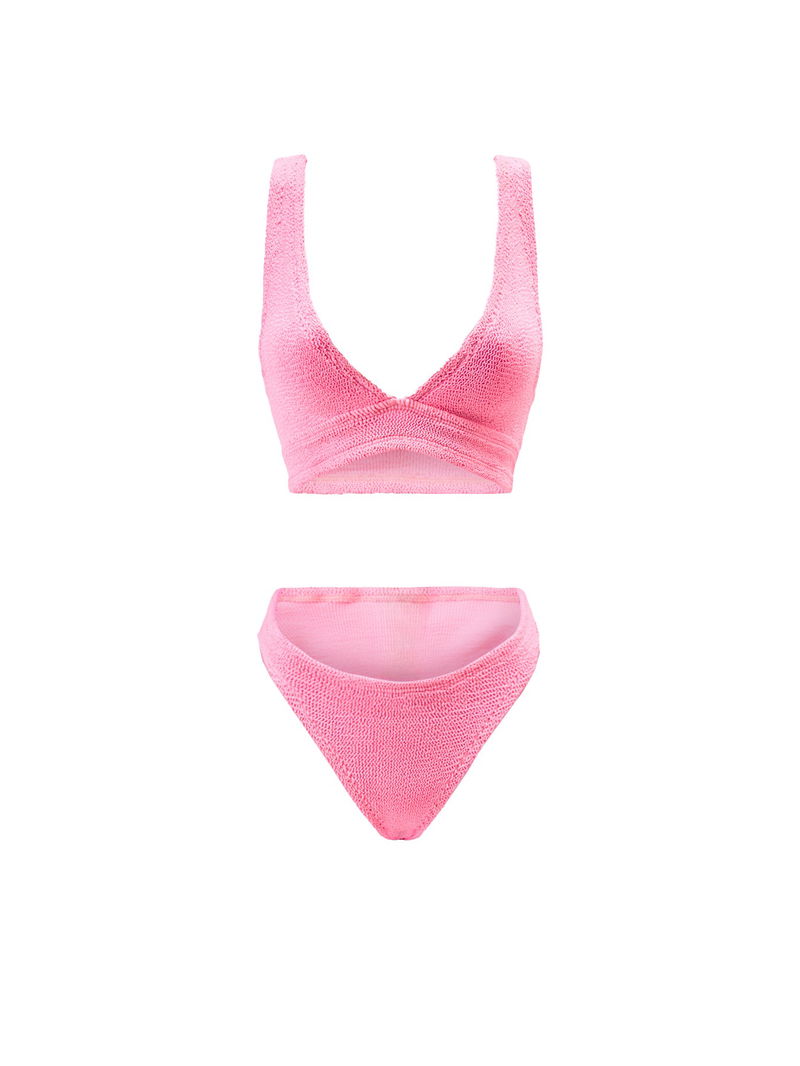 The Carla Bikini by Hunza G is crafted in the brand’s signature crinkle-stretch fabric, offering a flexible, flattering fit.