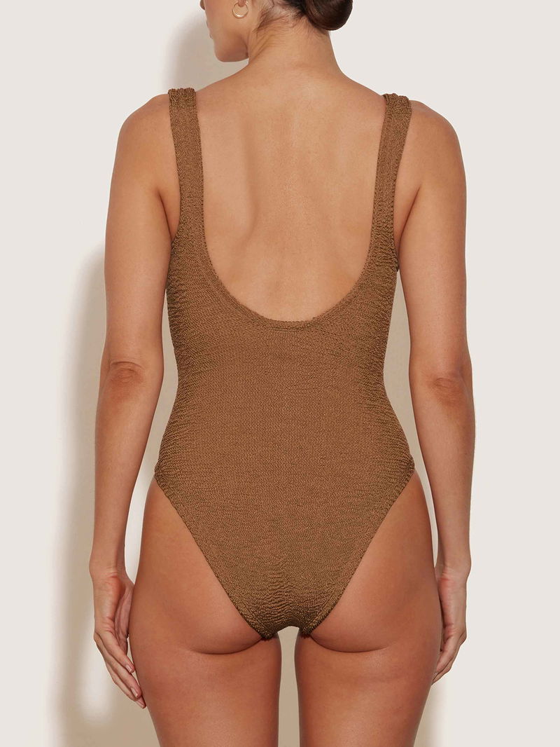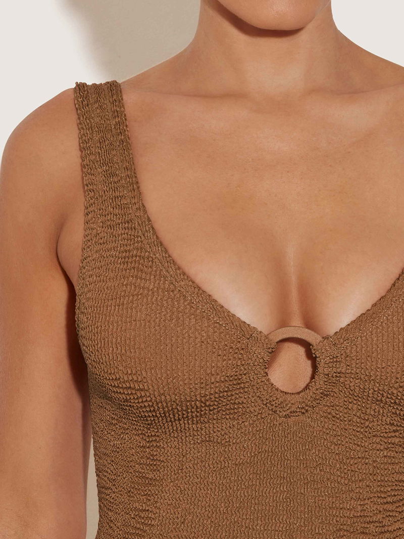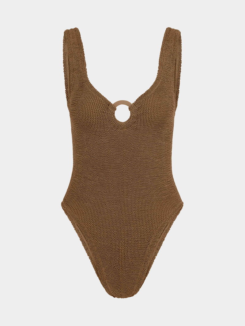 Modern swimsuit, timeless appeal. With tonal hoop detailing and a deep-v neckline, Celine has understated glamour down.
