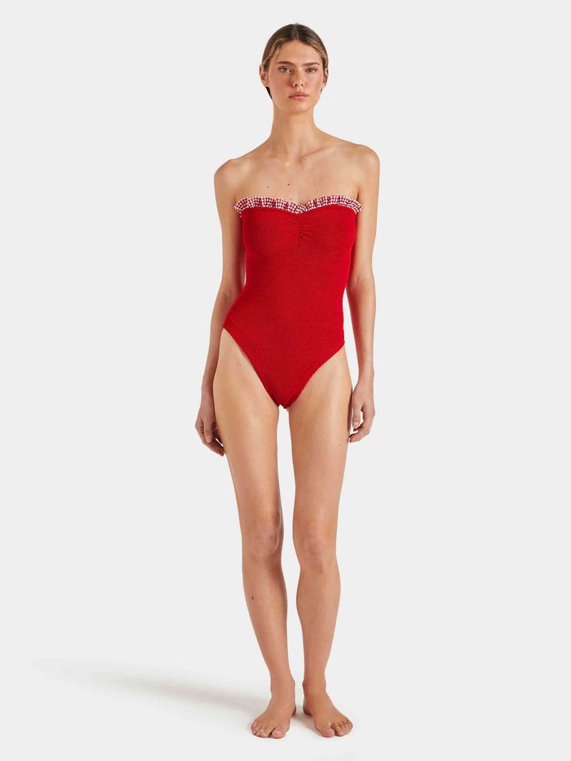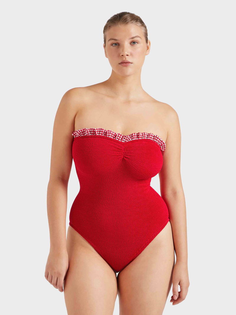 The Dolly swimsuit takes our iconic Brooke and adds a playful tonal seersucker gingham frill. Featuring a ruched sweetheart neckline and figure-sculpting silhouette.