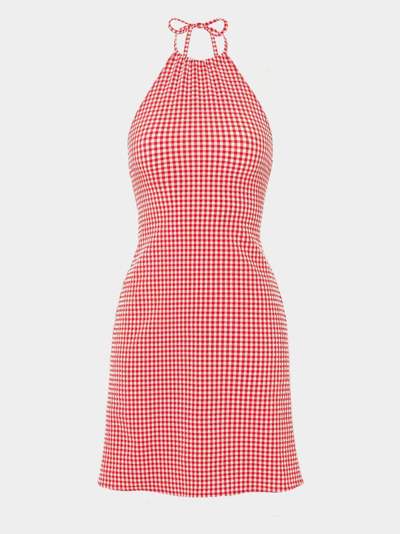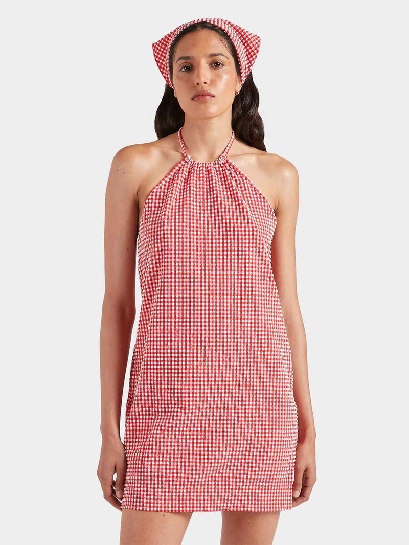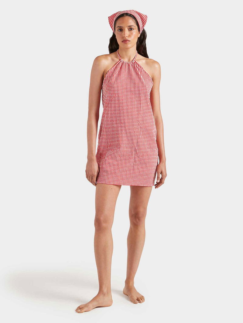 Swimmable ready-to-wear. Designed to be worn in and out of the water, the mini dress features and adjustable halter-neck, casual A-line fit and mid-thigh length.