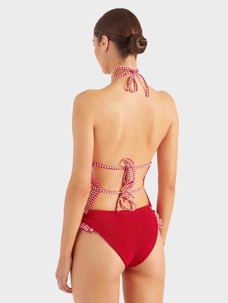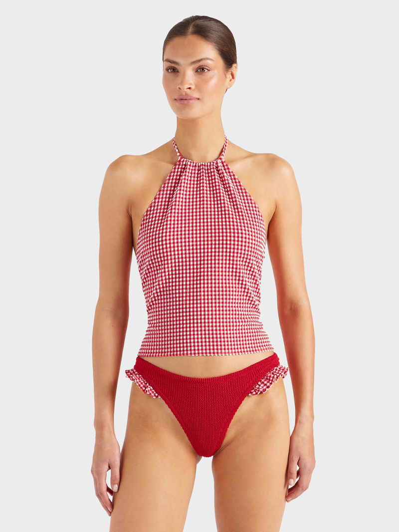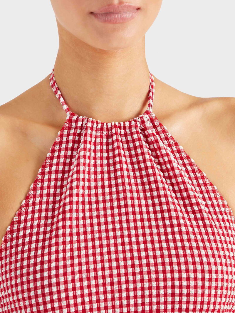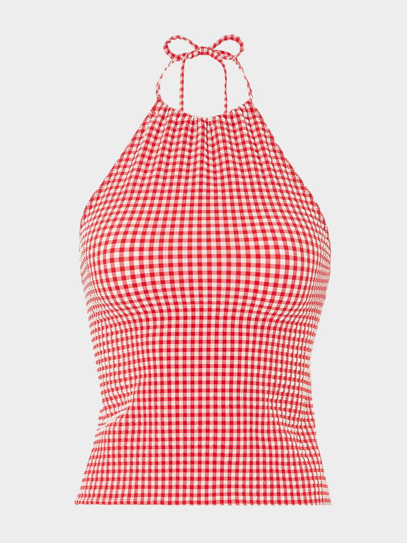 The all-summer-long top. Featuring a halter-neck silhouette, open back, and adjustable ties. This top can be worn in and out of the water, with ultra-lightweight, quick-drying seersucker fabric in a timeless gingham print.