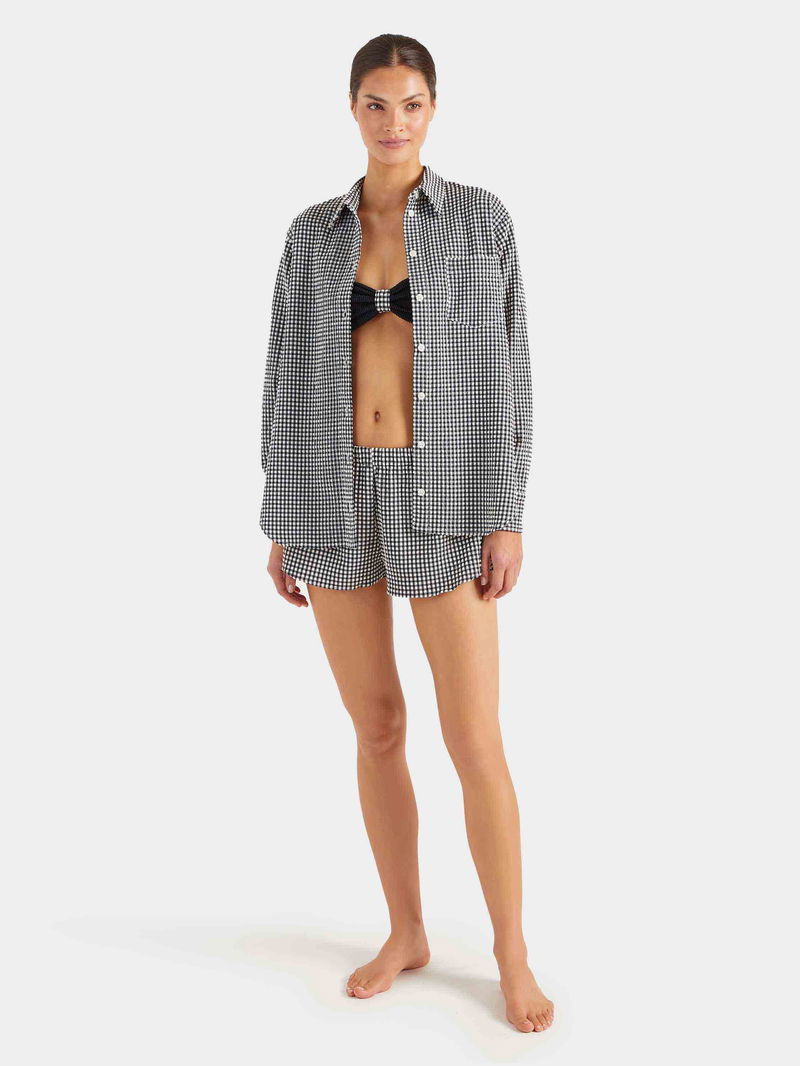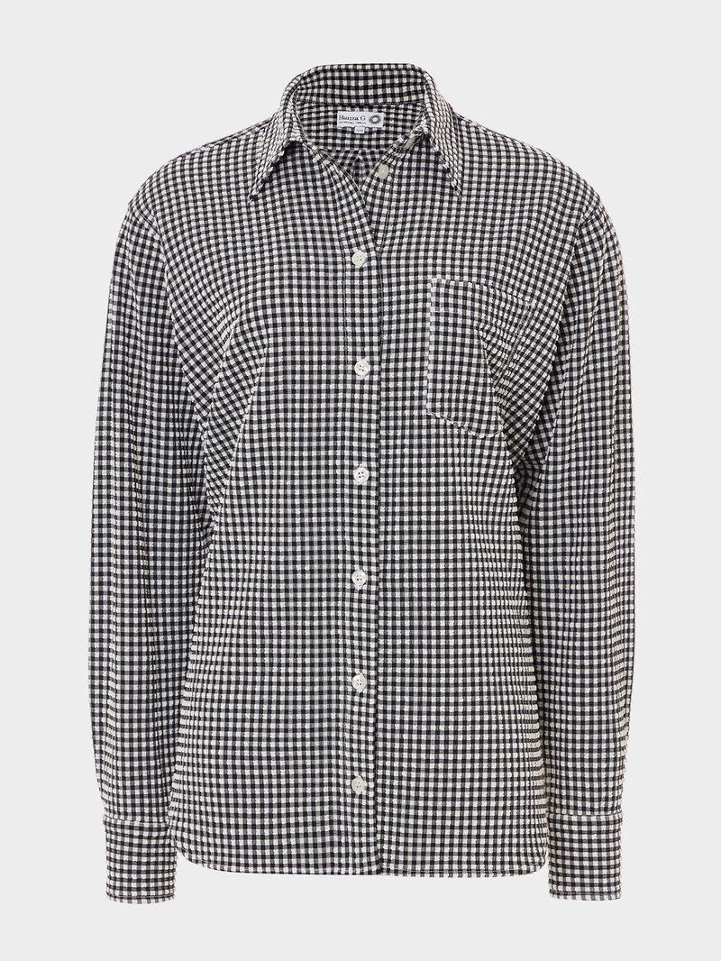 Fabricated from ultra-lightweight, woven bi-stretch seersucker, the gingham shirt offers UPF protection from the suns rays. Designed to be worn in and out of the water, this quick-drying piece is an essential for easy summer styling.