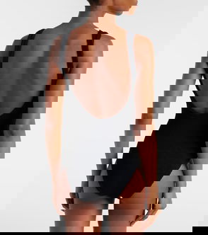 Shirred stretch nylon jersey one-piece swimsuit.· Square neck· Fixed criss-crossing shoulder straps · O-ring at low back· Unlined.
