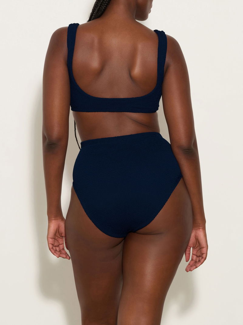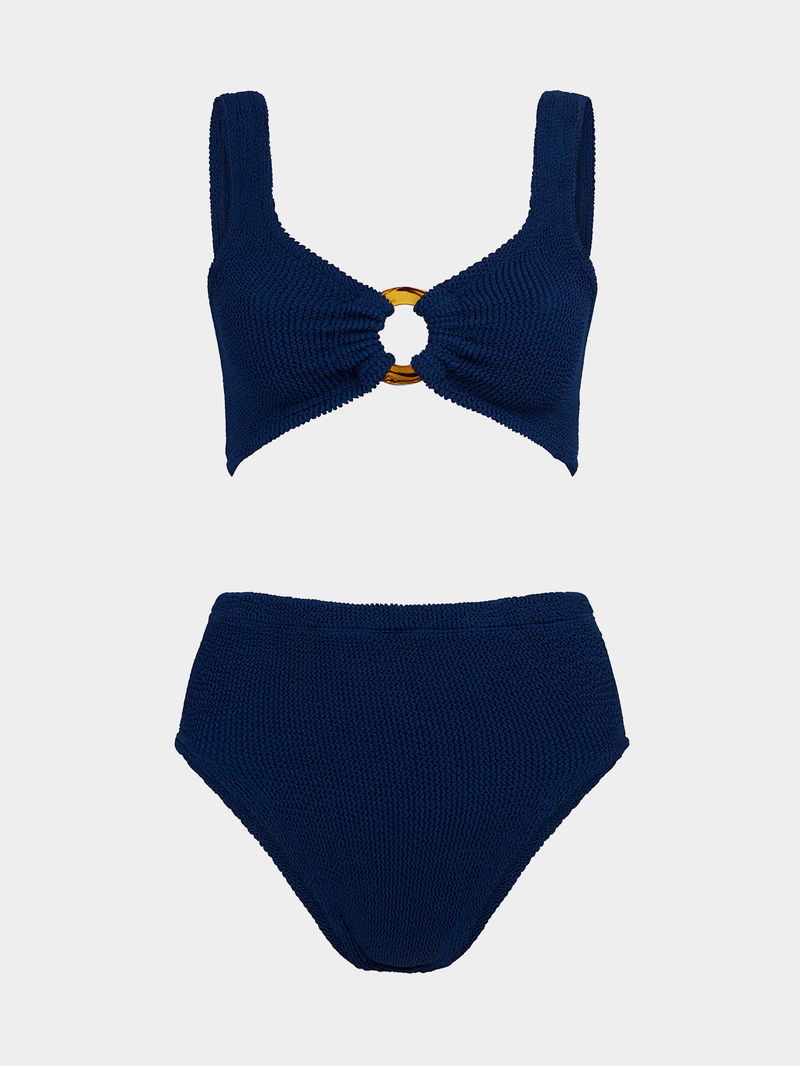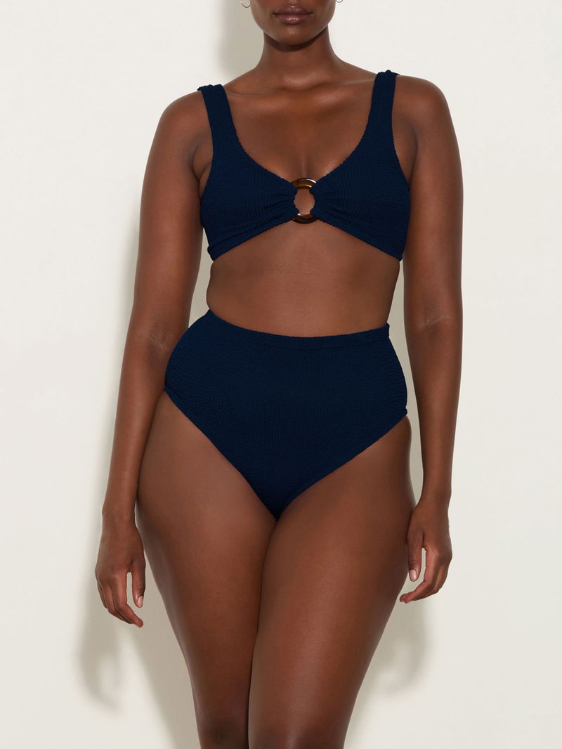She's got it all. Nadine's high-waisted bikini bottoms and tortoiseshell hoop detailing have comfort with a serving of understated glamour.