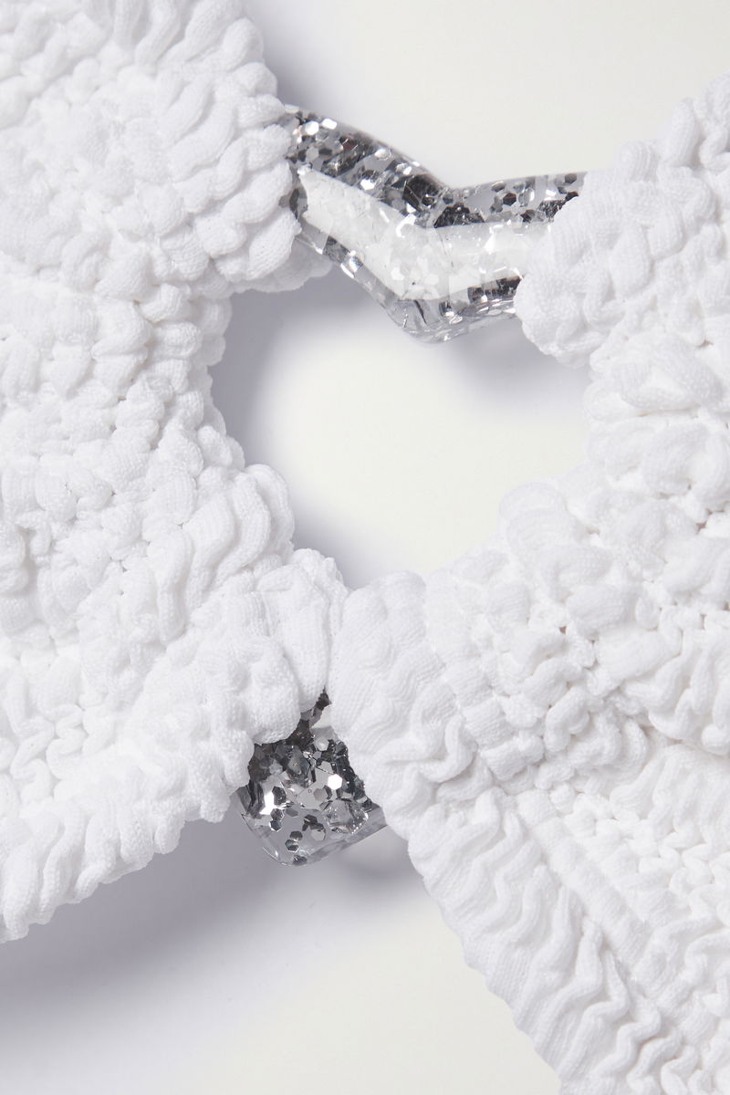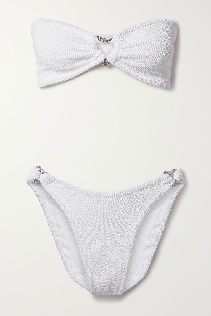 Hunza G's 'Nicole' bikini is designed with glittered heart-shaped embellishments at the bust and hips that add a glamorous element. It's made from signature seersucker and has a bandeau top and briefs with high-cut legs.
