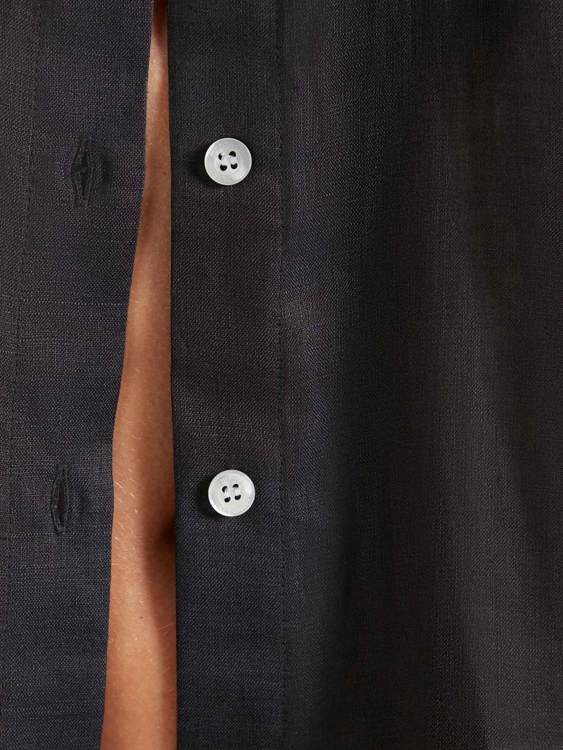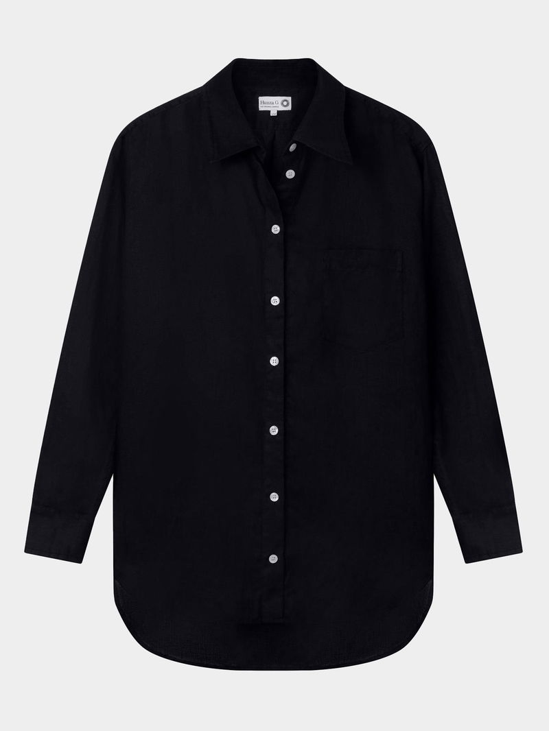 Easy, versatile, effortless. This oversized shirt shirt with branded buttons and a relaxed fit. Made to wear as a beach cover-up, weekend loungewear, relaxed evening dressing, and more. Available in three sizes.