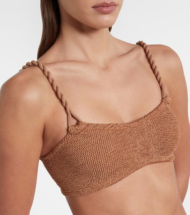 The Phoebe bikini is made using Hunza G's Seamless Crinkle Technology, making it one-size-fits-all. The set features triangle bottoms and a bandeau top with twisted straps.