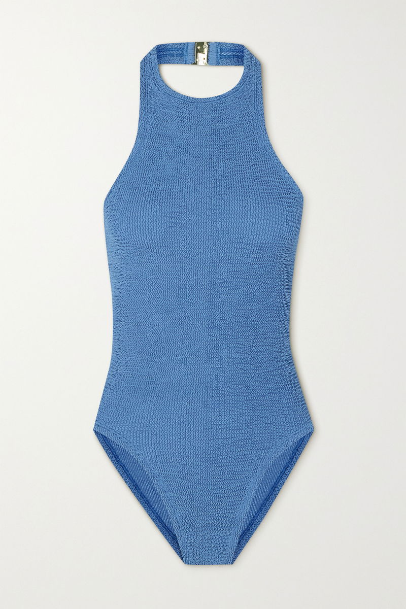 Hunza G's 'Polly' swimsuit is modeled after the label's beloved mini dress of the same name. It's been locally made in the UK from signature seersucker and has a one-size-fits-most design with a high-cut halter neckline and an open back. Wear yours poolside or as a bodysuit with jeans or shorts.