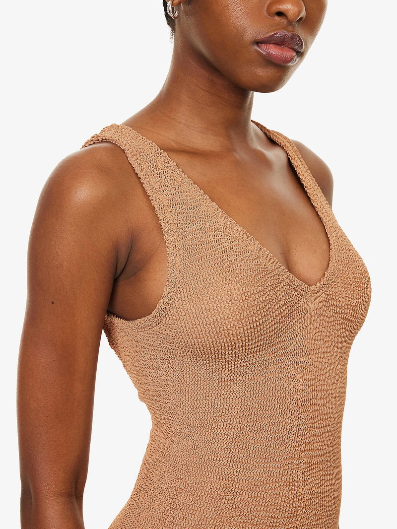 • Plunge neckline, scoop back, moderate rear coverage, crinkle texture