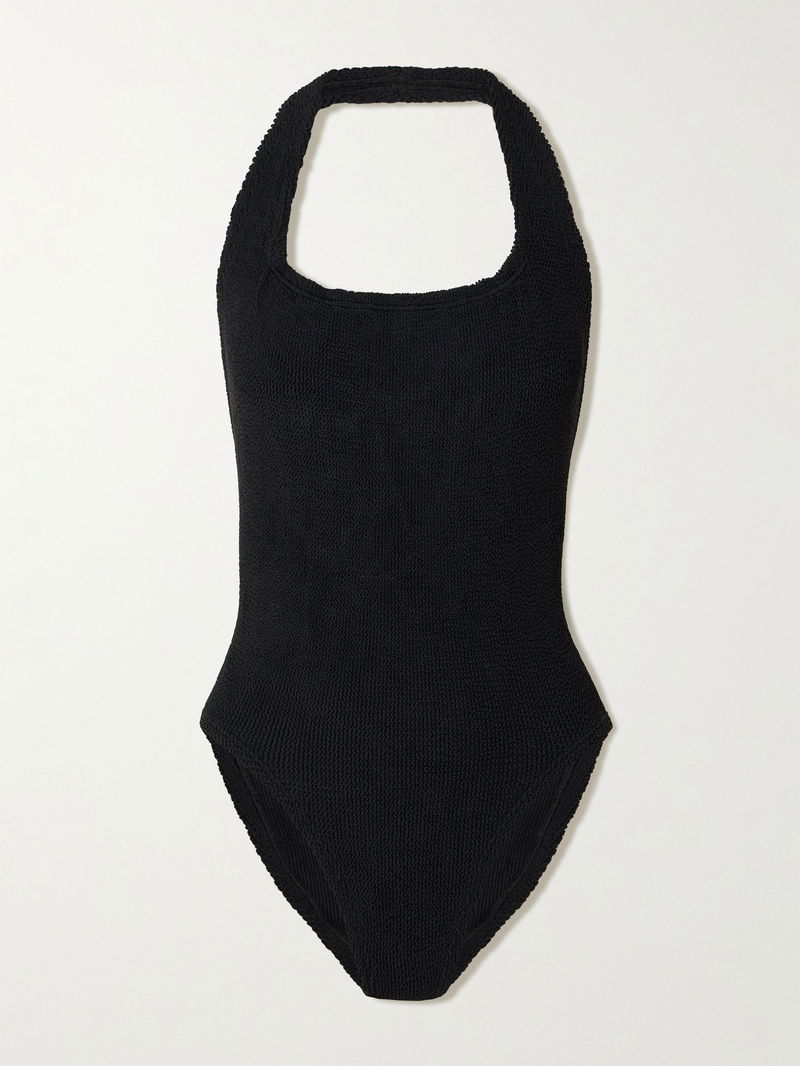 Hunza G's 'Sandy' swimsuit is crafted from the label's signature seersucker and re-imagined in a flattering halterneck silhouette. It features a square neckline and an open back. Timeless and versatile, it's a piece you’ll reach for on every getaway.