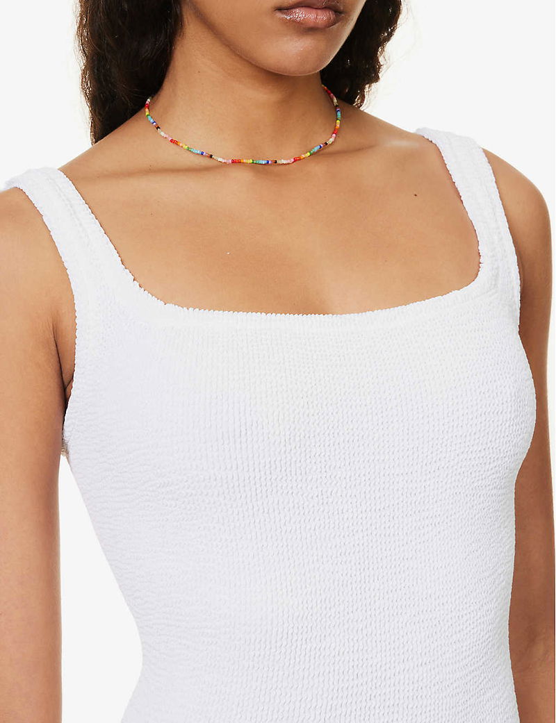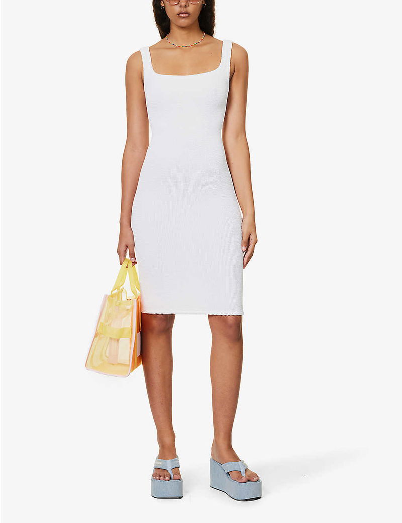 Swimwear and scrunchies aren't all Hunza G's signature seersucker fabric is good for. That's right, the label's crinkle cloth is put to work to fashion the silhouette of this mini dress too. Figure-hugging and stretchy, the sleeveless style clings to the contours of your frame, adapting with every stride, meal and stretch. It's then simply shaped with a scoop neck and straight hem to leave all eyes on that all-important crinkle.