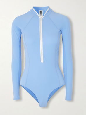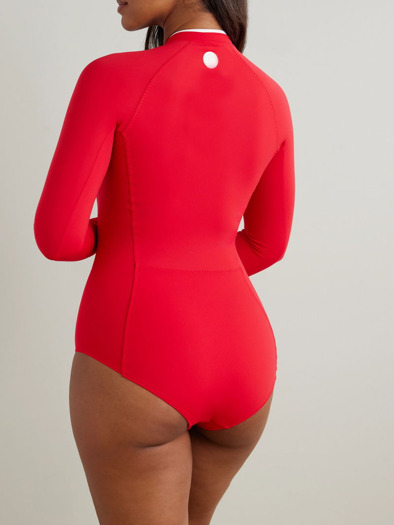 Hunza G's 'Tyra' swimsuit has an athletic spin, thanks to the piping and half-zip accent that you can adjust to your choosing. It's complete with UPF 50+ sun protection qualities and has a rubber logo at the back of the raised neckline.