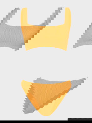 Hunza G seersucker bikini. Top: square-neck, low back, slips on. Briefs: elasticated, pull on.