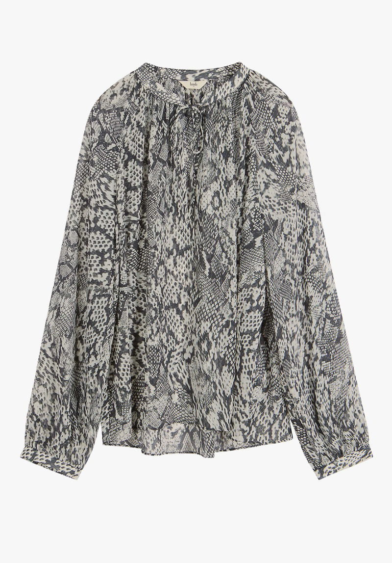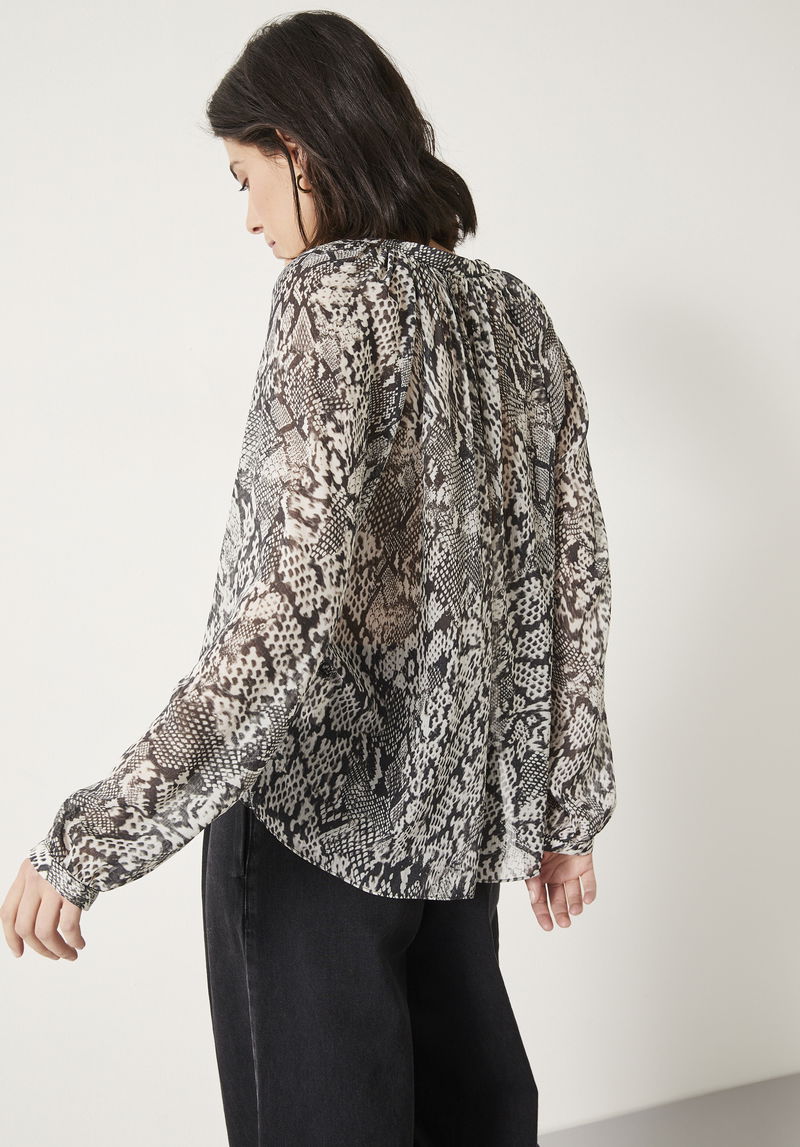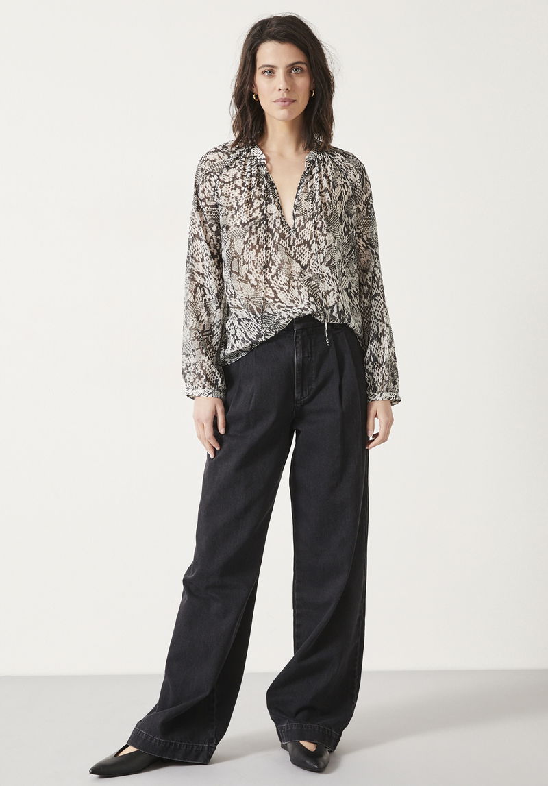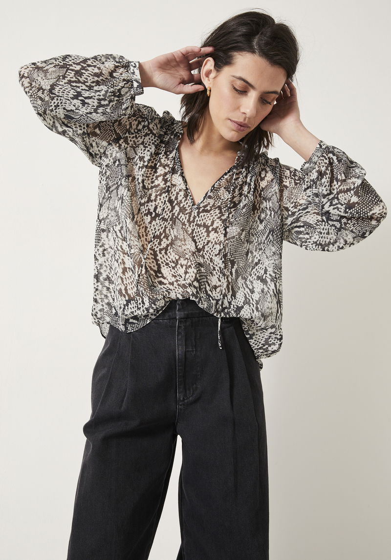 Tuck its monochrome snake print peer out from under blazers and contrasting knits, or take advantage of its breezy silhouette and tuck it into high-rise denim while the sun still shines.