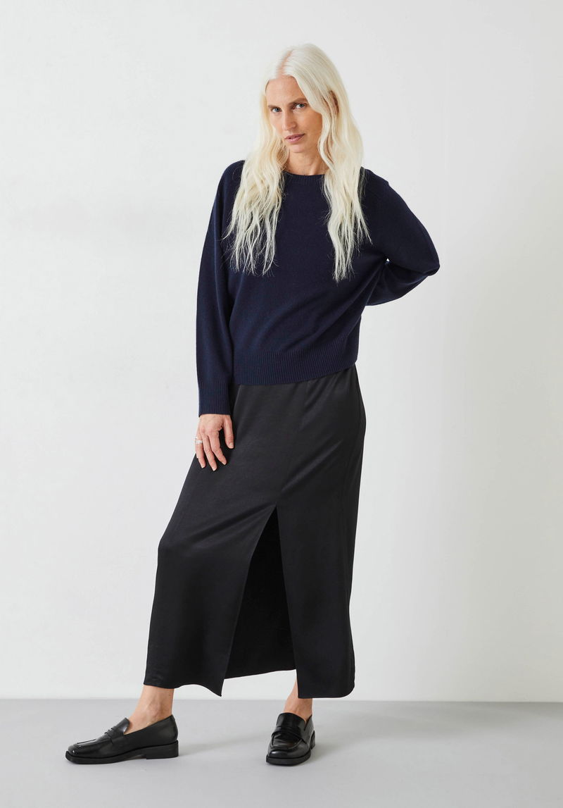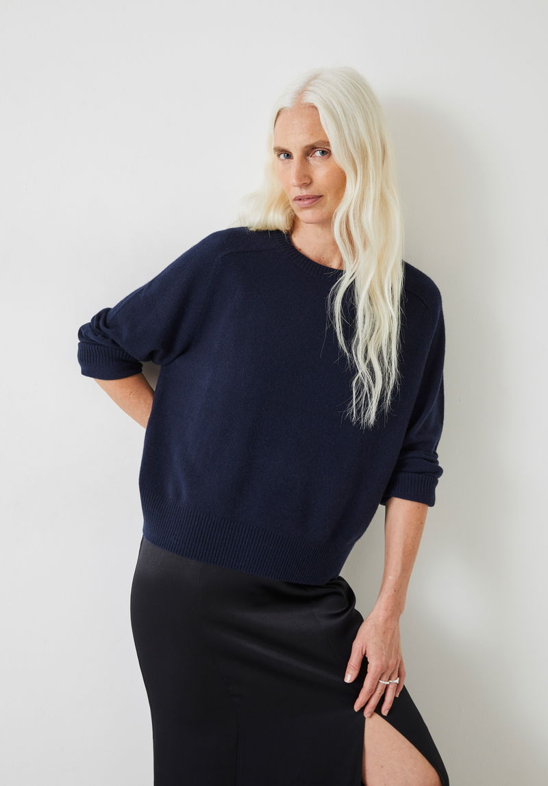 Grey skies got you down? We’ve got one word that'll cheer things up: cashmere (and ours is fully traceable, by the way). We’ve used a neutral navy version of the famously soft fabric to form the ultra-comfortable, slouchy silhouette of our Alina sweatshirt. Well, that’s one way to beat the blues.