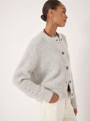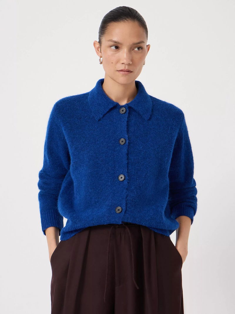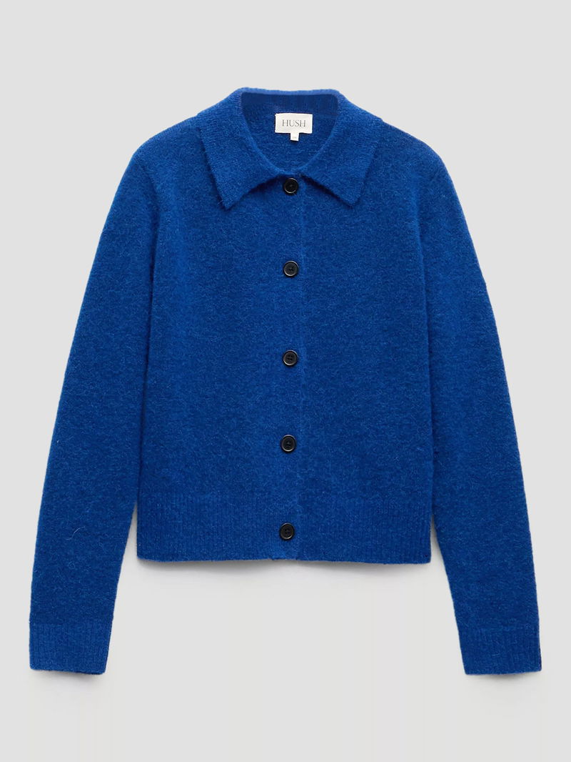 A fine wool blend cardigan from HUSH. Its smart collar and easy button fastening make it perfect for layering when you need warmth and style.