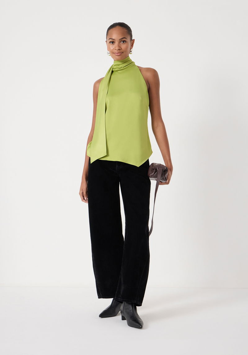 Low-key glamour with little to no effort? It's all in the fabric, like this beautiful satin top which ties into a simple halter neck design. We've added a long, swishy tie for added movement, and the hem finishes in a subtle point that feels modern and intentional. Dress it down with corduroy trousers for a more laid-back take on partywear.