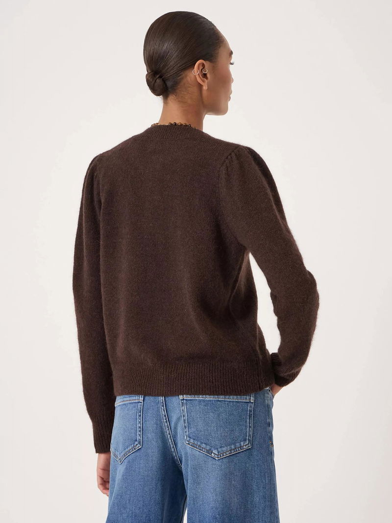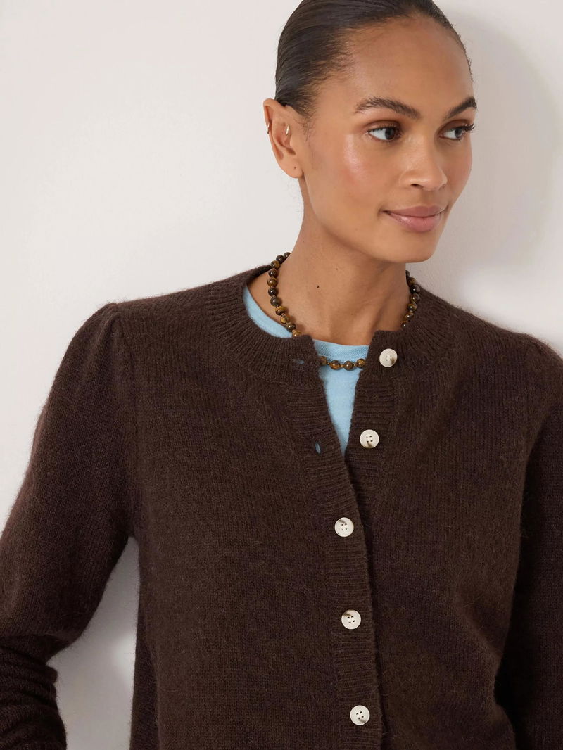 Puff Shoulder Wool Rich Cardigan, Dark Brown