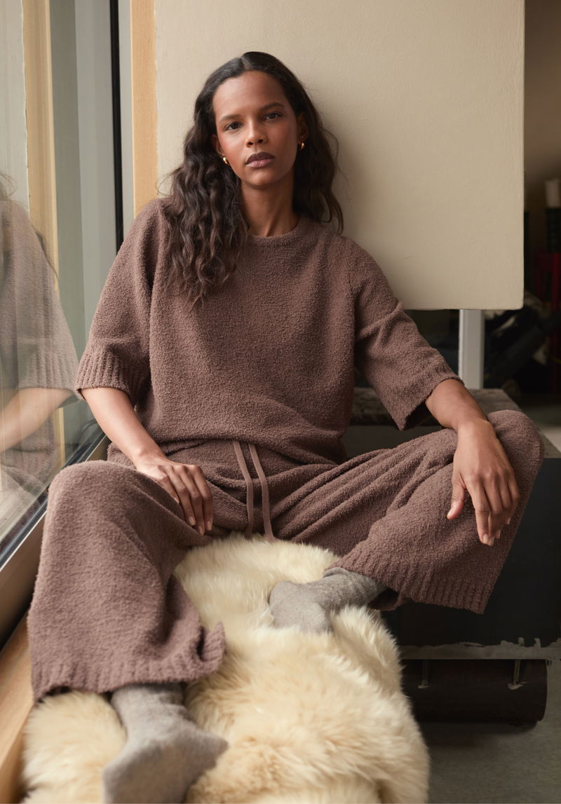 Loungewear we can binge-watch our favourite series in and also wear to run errands out and about? This is our supersoft lux top, cut to a roomy fit with elbow-length sleeves. We've given the fabric a textured finish, and we can't get enough of this mocha brown shade which looks so good paired with the matching trousers as a coordinating set.