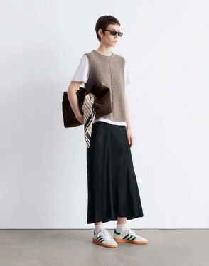 A feminine and elegant skirt in a silky, shiny look which creates an elegant feel. It is mid length and has an elasticated waistband at the back.