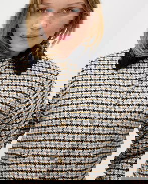 Description: Jacket, Checked, Wool-blend tweed, Drawstring waist, Snap-fastening cuffs, Front flap pockets, Breast pockets, Snap and concealed zip fastenings through front, Mid-weight, non-stretchy fabric.