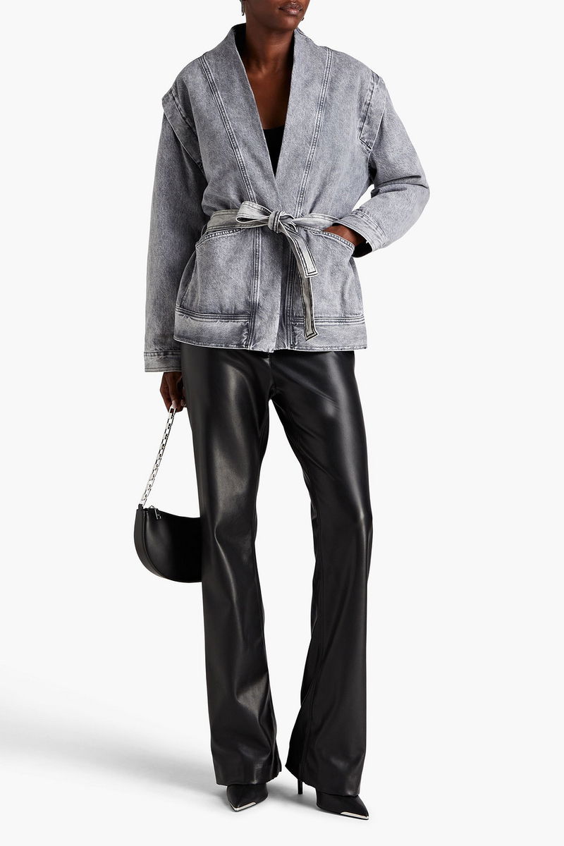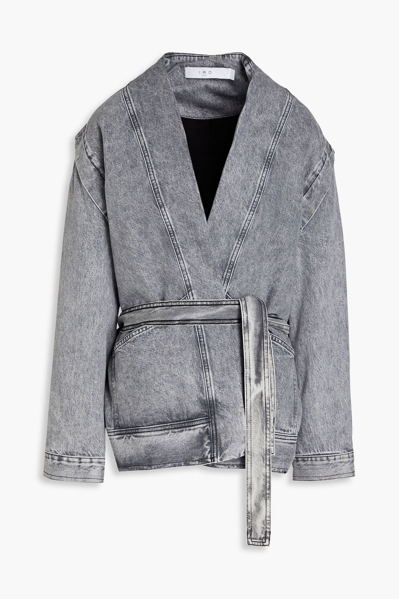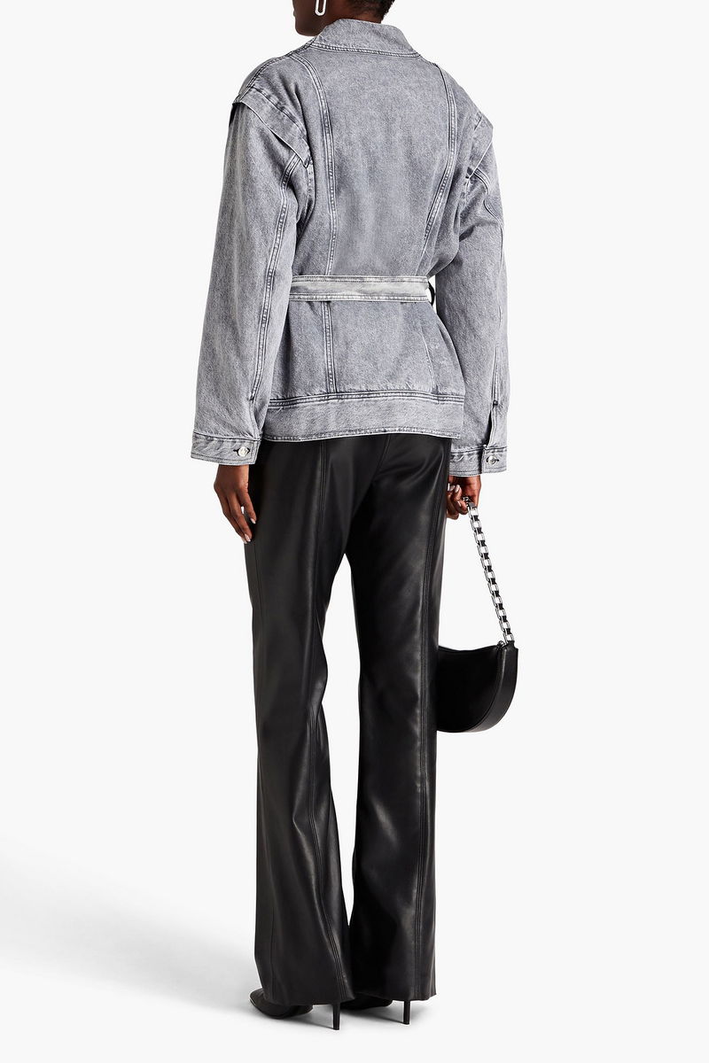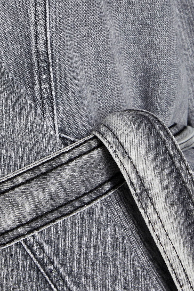 Jacket, Acid-wash, Denim, Detachable waist tie, Buttoned cuffs, Two front patch pockets, Ties at waist, Synthetic filling, Non-stretchy fabric, Mid-weight fabric.