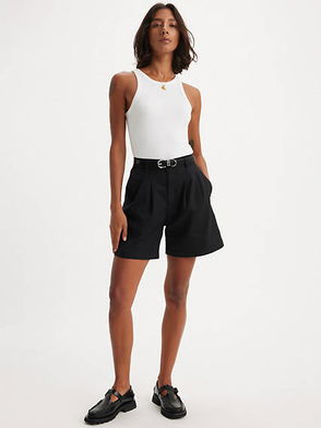 Shorts, Leather, Pleated, High-rise cut, Two side slit pockets, Two back welt pockets, Ties at front, Concealed zip fastening along front, Fully lined.