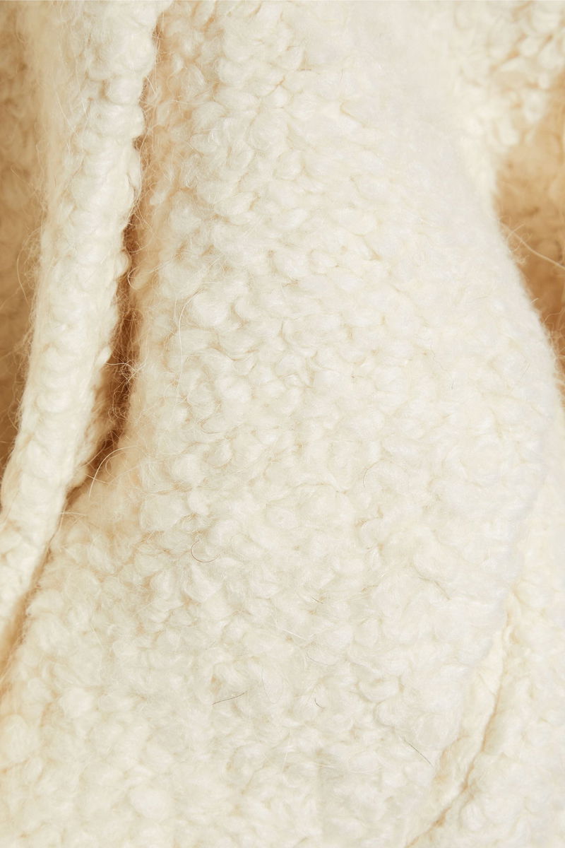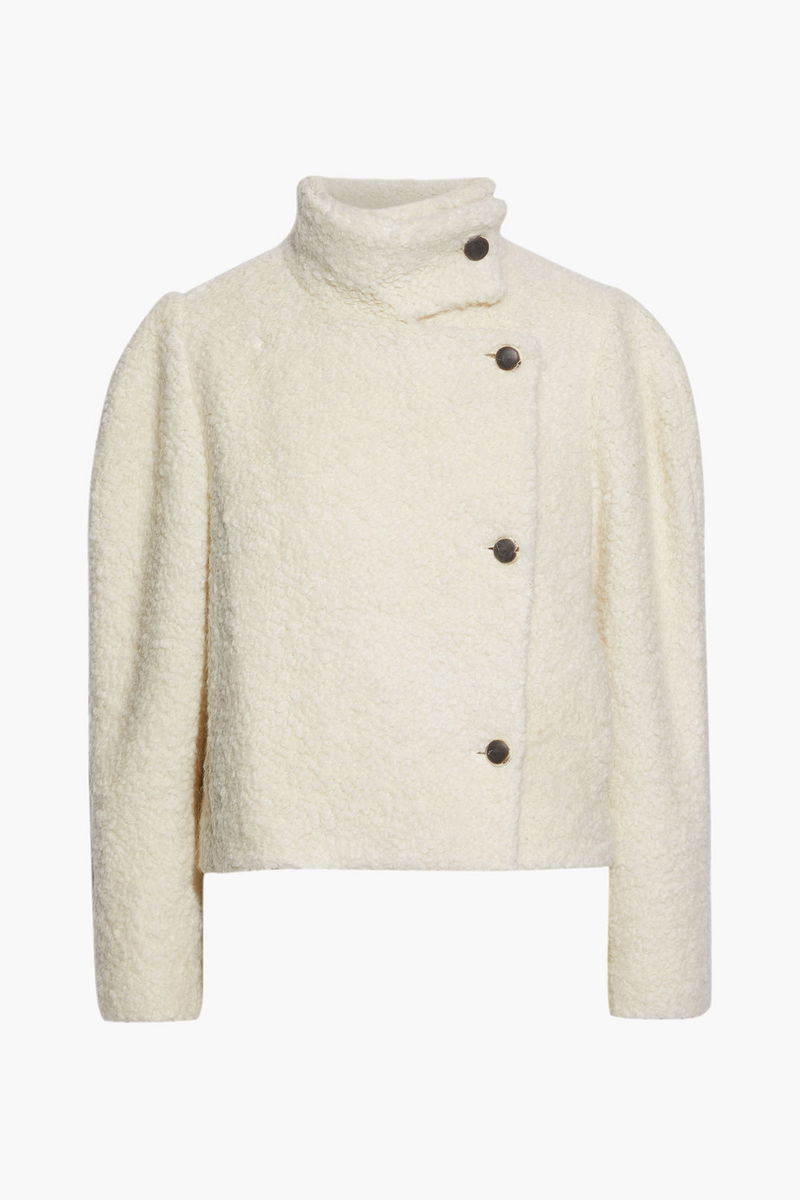 Jacket, Bouclé, Brushed, Cropped, Gathered sleeves, Two front slit pockets, Asymmetric button fastenings through front, Fully lined, Slightly stretchy fabric, Mid-weight fabric.