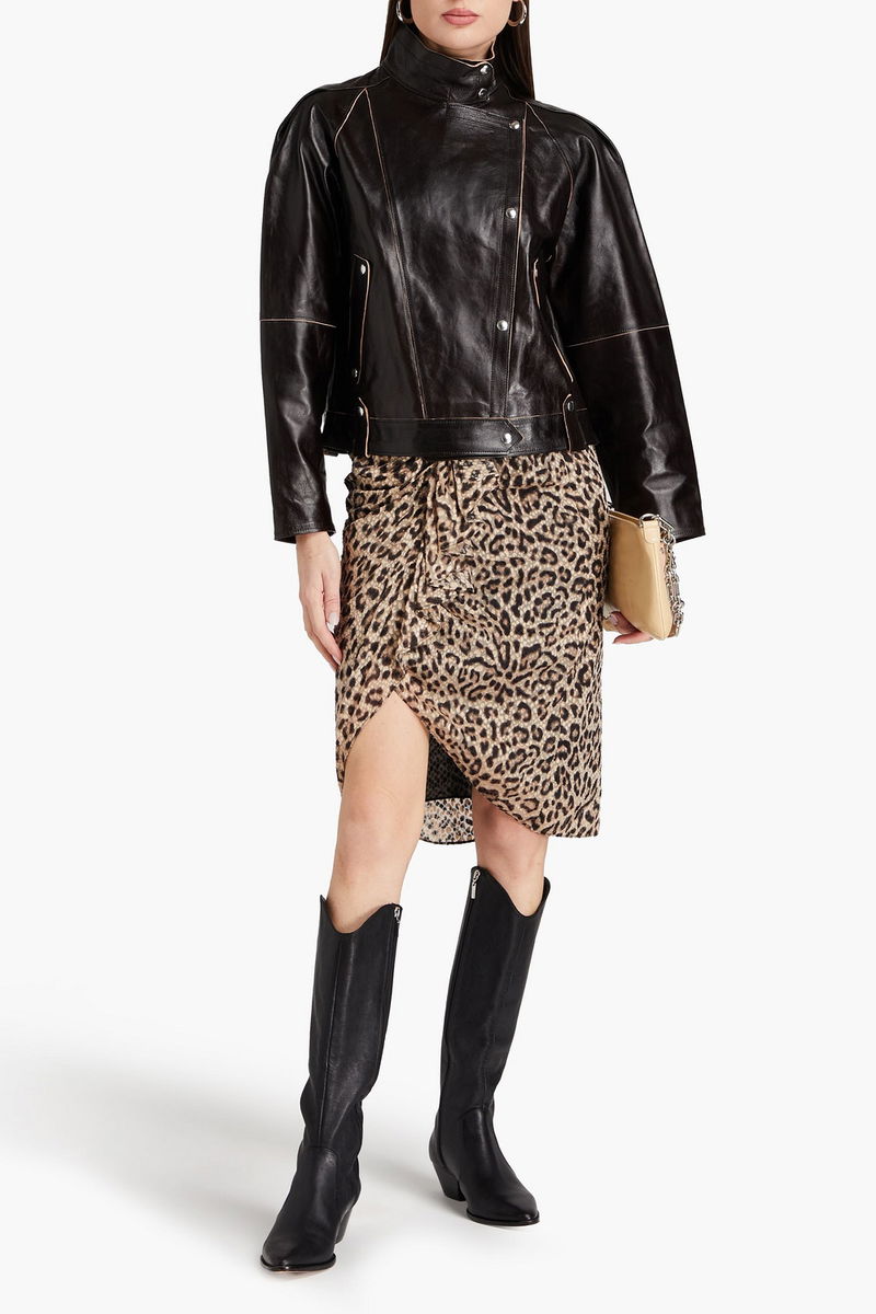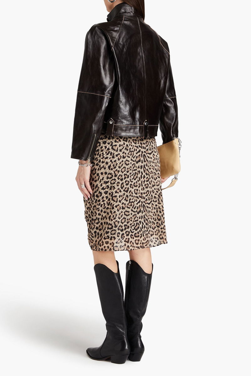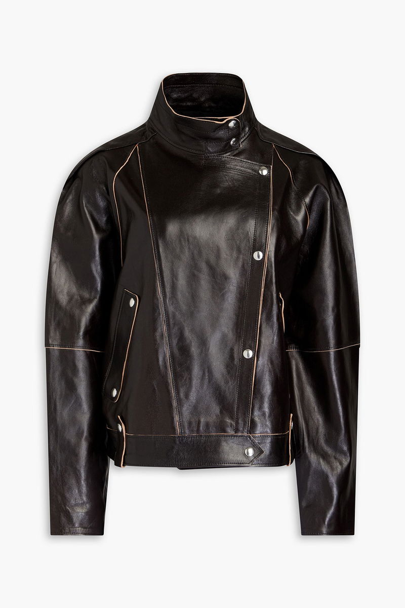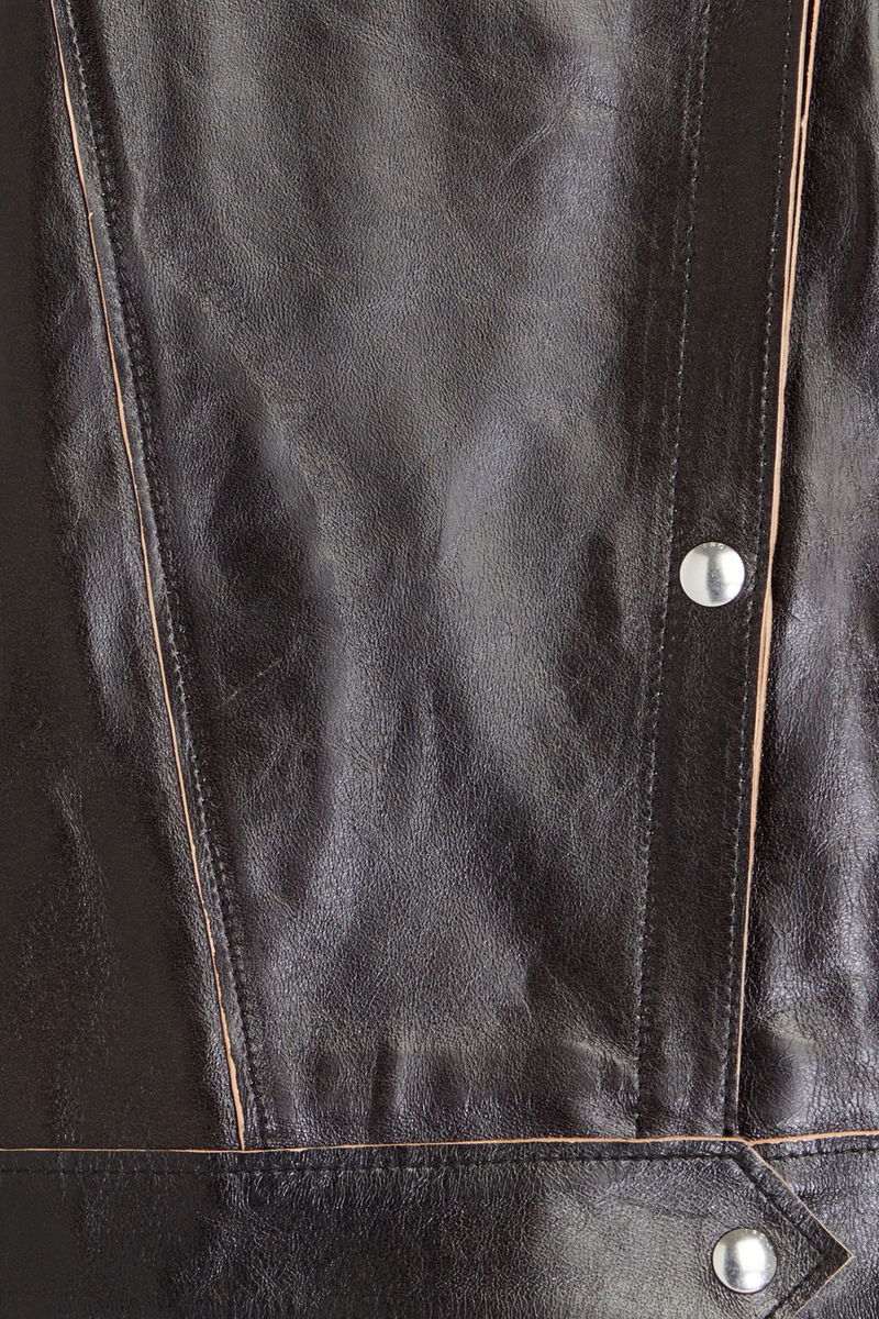 Biker jacket, Zipped cuffs, Two front slant pockets, Snap fastenings through front, Firm, non-stretchy leather, Mid-weight fabric.