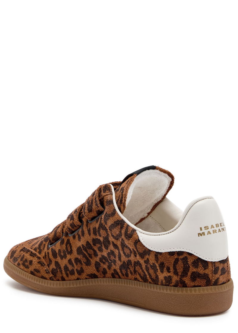 Isabel Marant Étoile brushed suede sneakers. Leopard print, designer plaque at padded tongue, quilted leather logo at side, padded heel, designer-stamped leather heel panel, textured rubber midsole, gripped rubber sole, round toe.