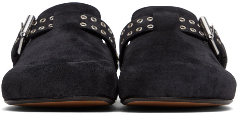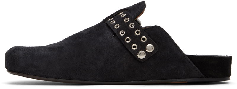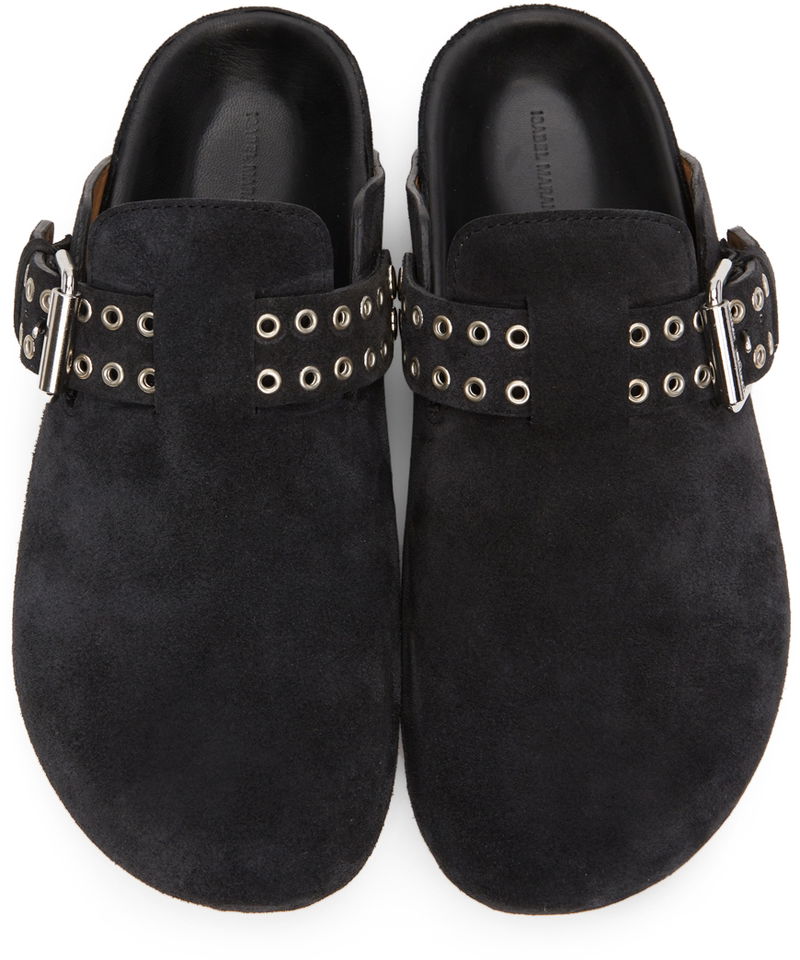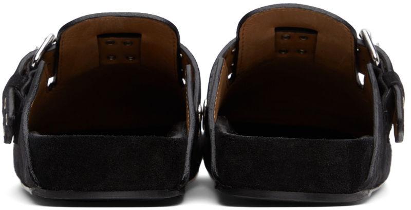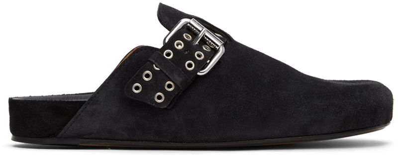 Calfskin suede slippers in black.
