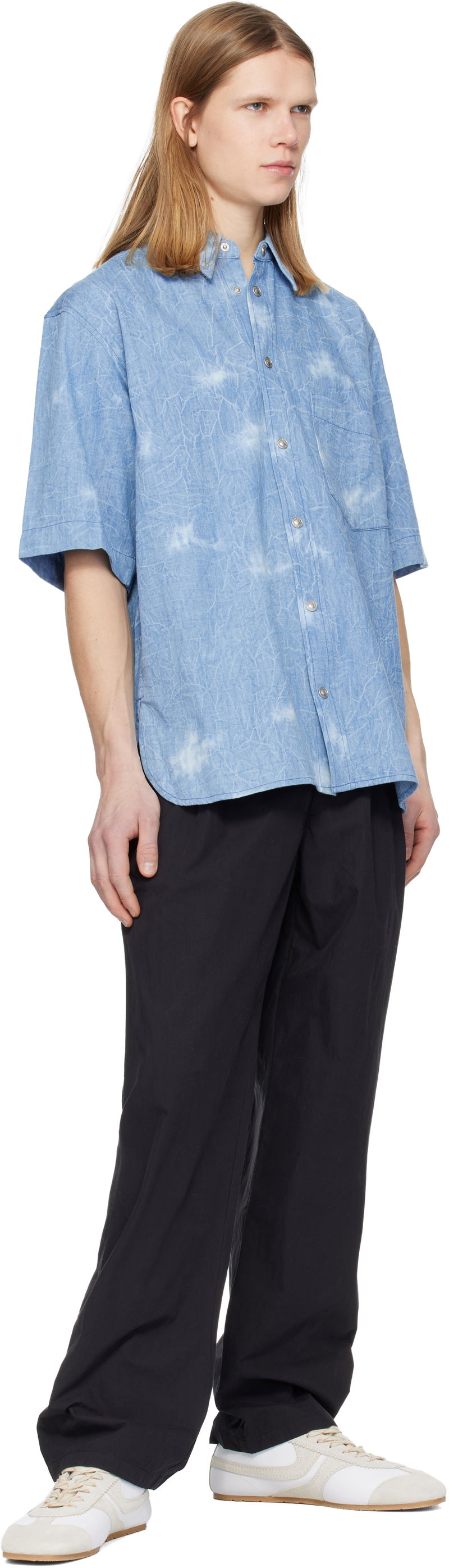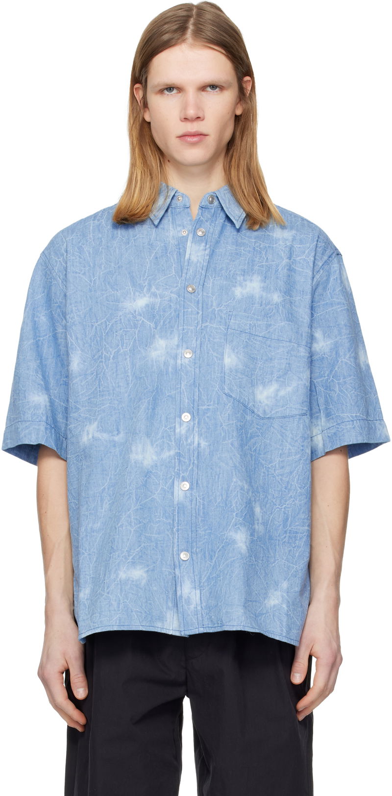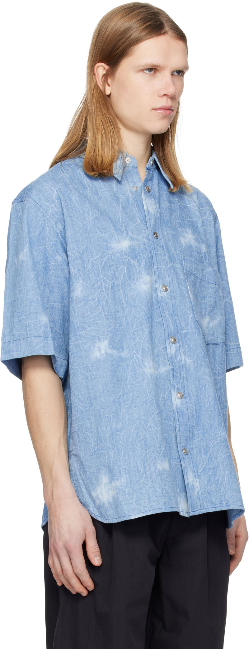 Cotton chambray shirt. Fading throughout. Spread collar. Press-stud closure. Patch pocket at chest. Tennis-tail hem. Dropped shoulders. Pleats at back yoke. Logo-engraved silver-tone hardware.