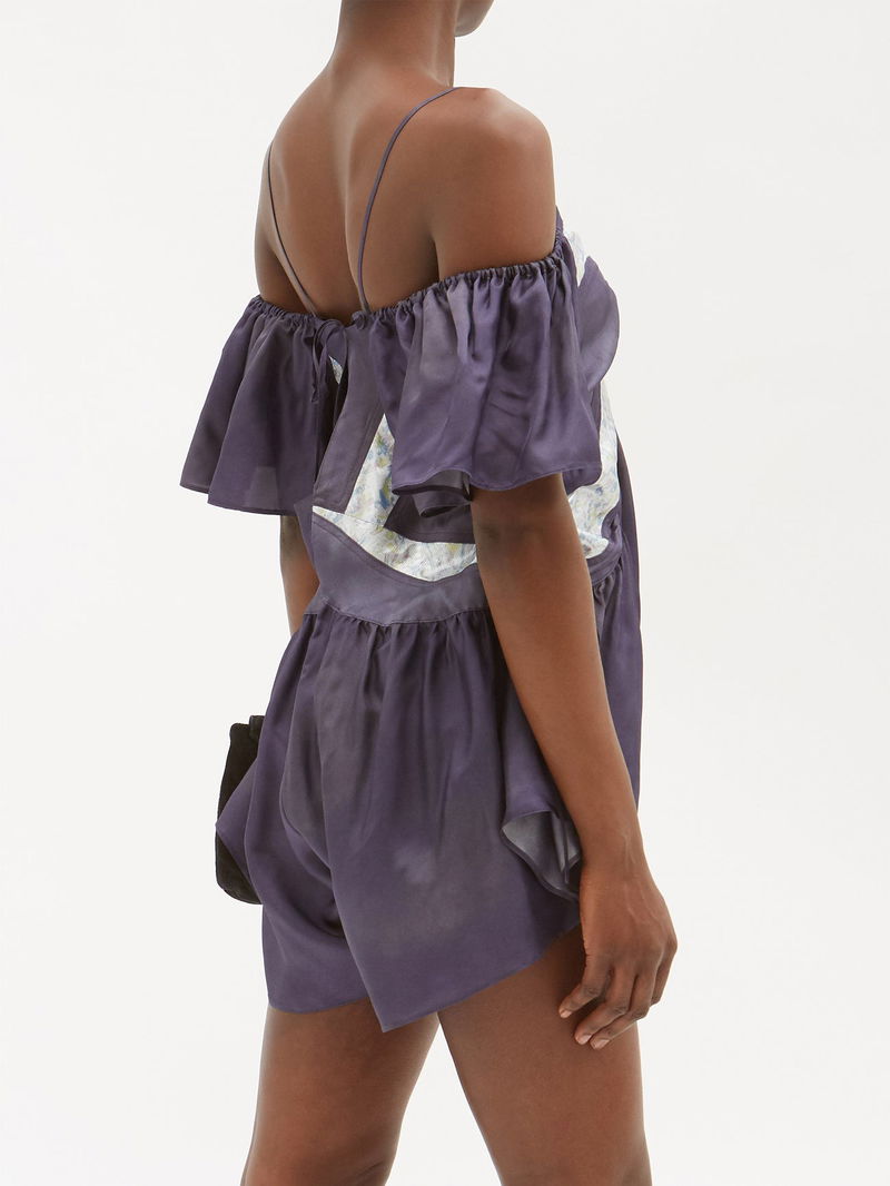 Isabel Marant draws on 80s-style sportswear to make this purple Brandi playsuit from lustrous satin to an off-the-shoulder silhouette with spaghetti straps and paisley panels.