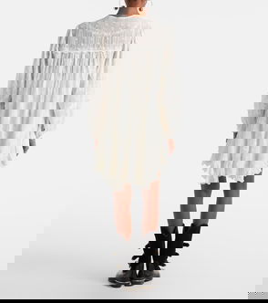 An exemplary Isabel Marant piece, the Dallin minidress is made from fresh white cotton poplin with broderie anglaise in a strong shoulder silhouette. It has a round neckline, elbow-length puff sleeves, and a fitted waist.