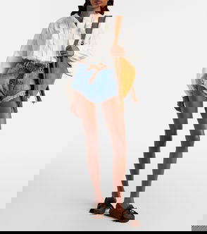 Non-stretch denim shorts. Fading throughout.· Belt loops· Five-pocket styling· Zip-fly· Fringed edge at cuffs· Logo patch at back waistband· Silver-tone hardware.