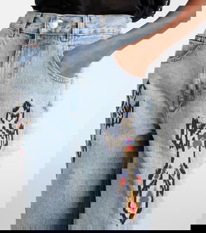 Loose-fit and flared coated stretch denim jeans. Metallic thread detailing throughout. · Mid-rise· Belt loops· Five-pocket styling· Zip-fly · Hammer loop at outseam· Patch pocket at outseam· Leather logo patch at back waistband.