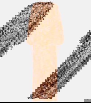 Semi-sheer viscose chiffon dress. Pleats, gathering, ruffled edges, and graphic pattern printed throughout.· Scoop neck converts to off-the-shoulder construction· Drawstring at elasticized collar· Keyhole at chest· Elasticized waist and cuffs· Asymmetric hem· Partial viscose chiffon lining.