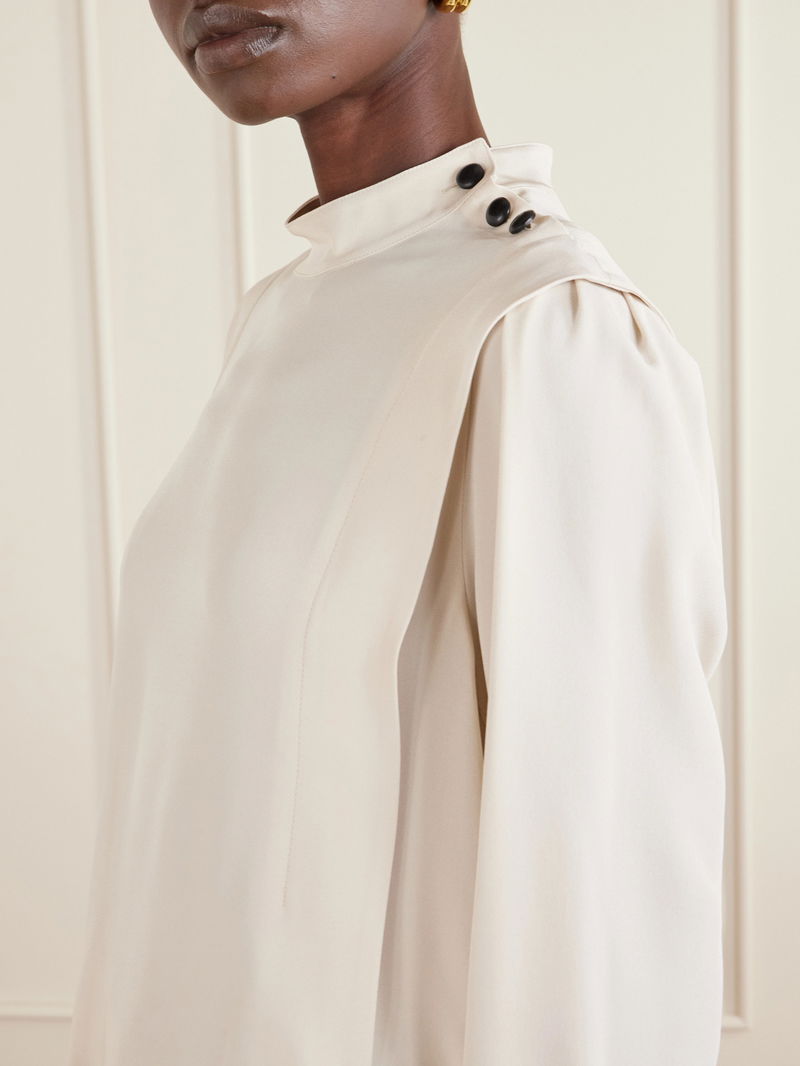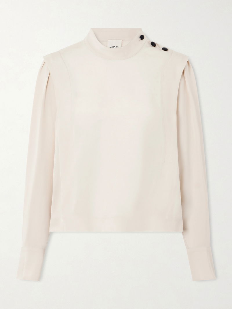 Isabel Marant's 'Felissa' blouse has wide shoulders that create a layered effect – the black buttons draw the eye. It's made from satin-crepe with a mockneck and relaxed fit.