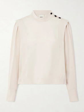Isabel Marant's 'Gelina' blouse is printed with abstract dots that beautifully contrast the fuchsia backdrop. Made from silk-blend crepe, it's designed with gathered tiers that create a peplum hem and has billowy sleeves for pretty volume.