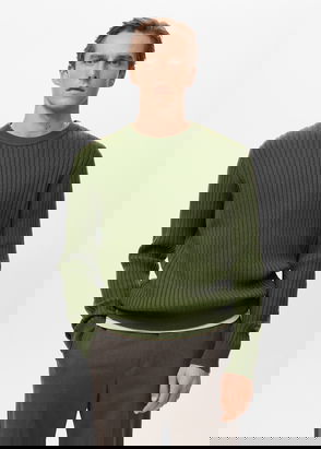 Patchwork knit acrylic-blend sweater. Metallic thread detailing throughout.· Rib-knit crewneck, hem, and cuffs· Dropped shoulders.