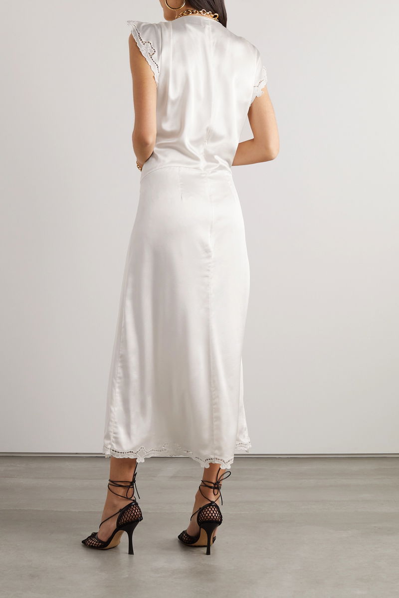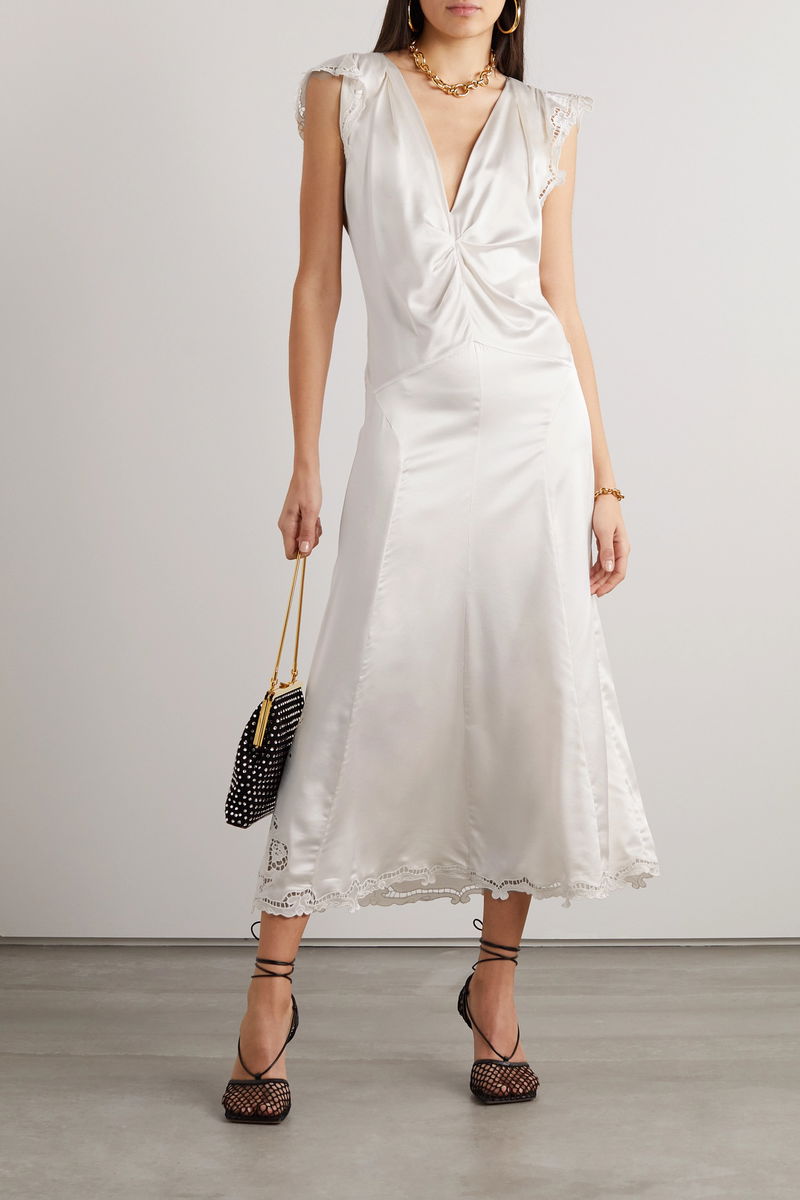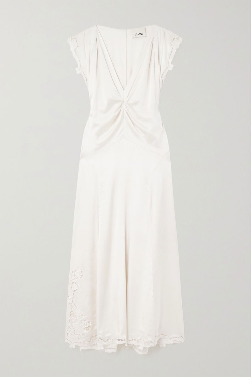 Isabel Marant's 'Jordina' dress takes cues from minimal lingerie-inspired silhouettes. Made from shiny silk-satin, it has flutter sleeves, a plunging V-neckline and a ruched front that creates a beautiful drape. The delicate guipure lace trims add such a feminine feel. Pair yours with stacks of bracelets and heels.