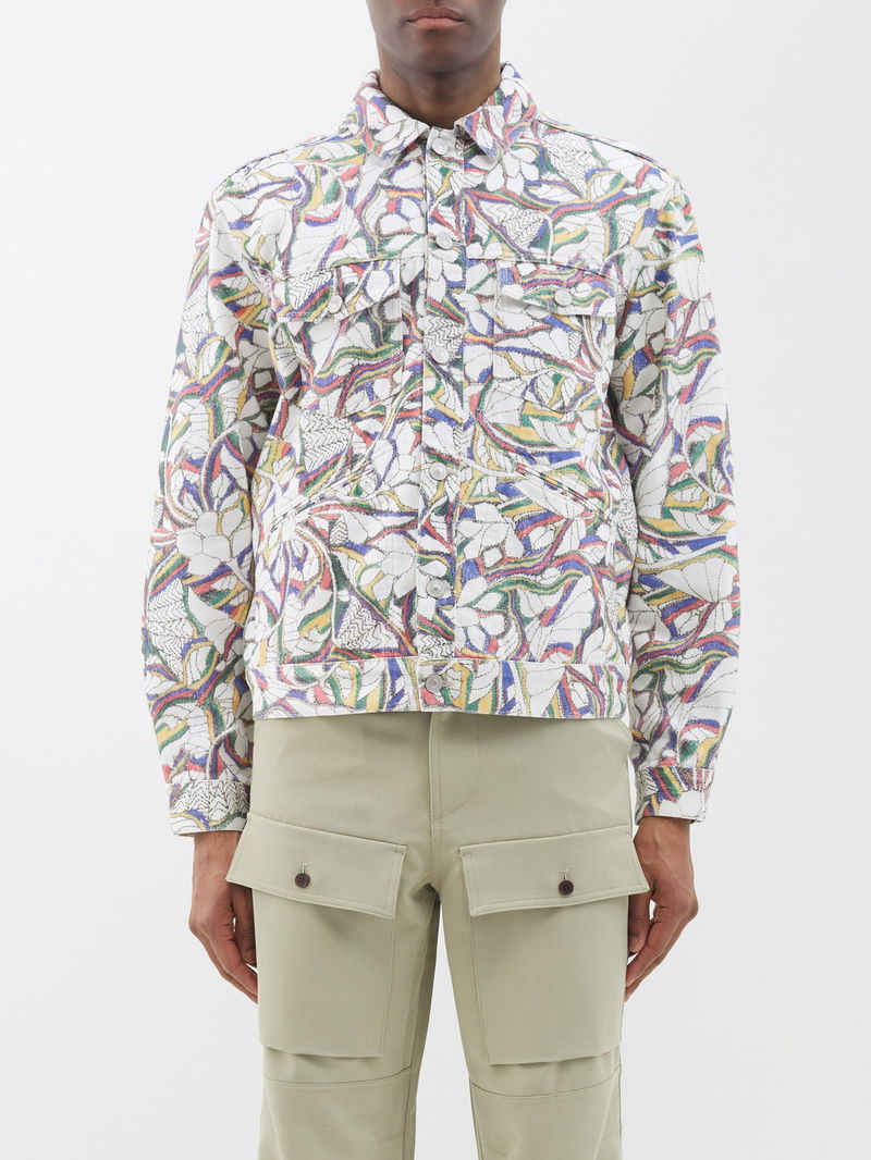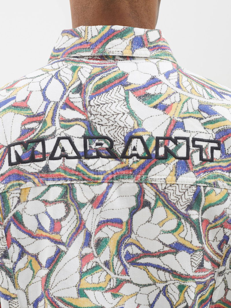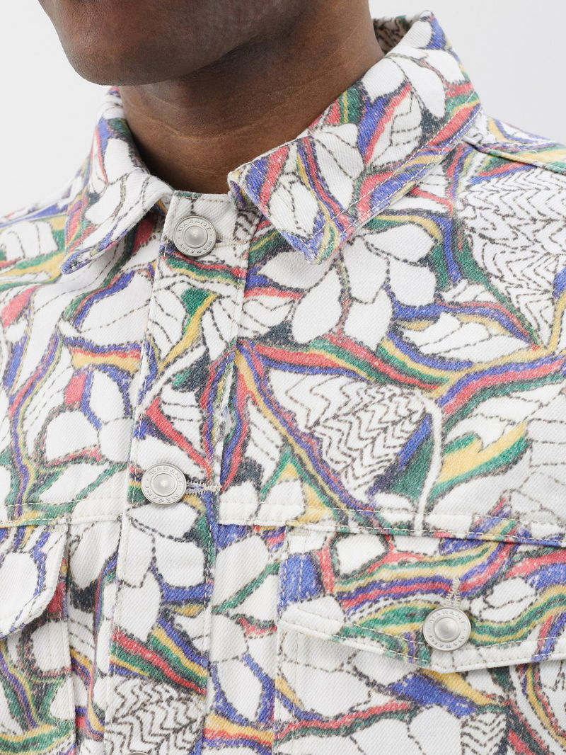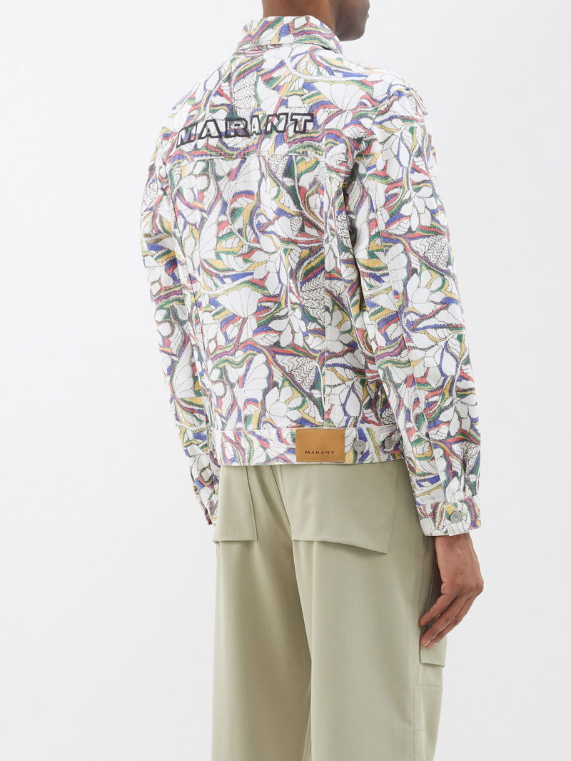 Isabel Marant's multicoloured jacket is crafted from structured cotton denim, complete with a bold floral print and a striking logo embroidered across the shoulders.