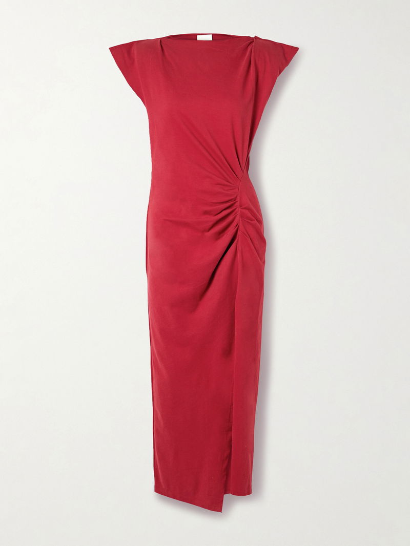 Isabel Marant frequently updates its 'Nadela' dress in a variety of fabrics and colors. This version is cut from fluid cotton-jersey that's gathered at the waist and has padded shoulders for structure.