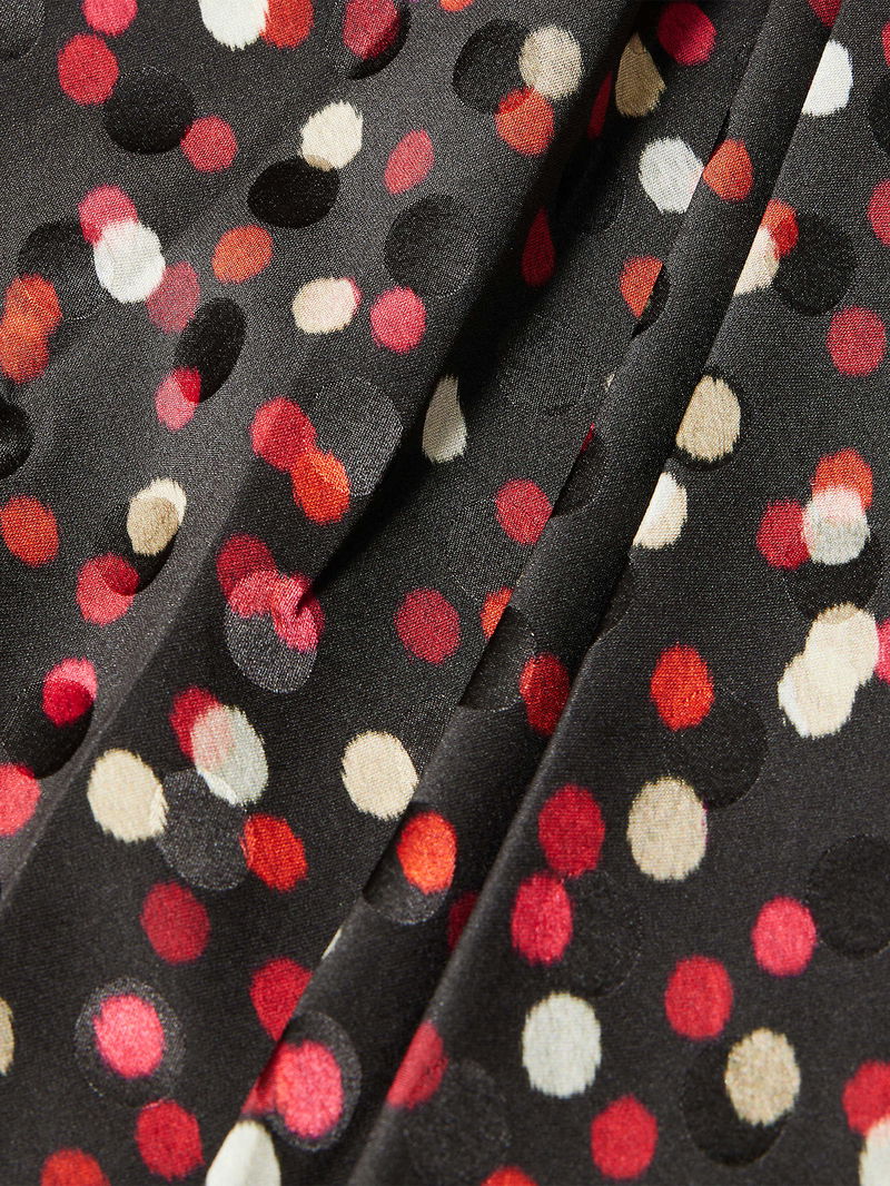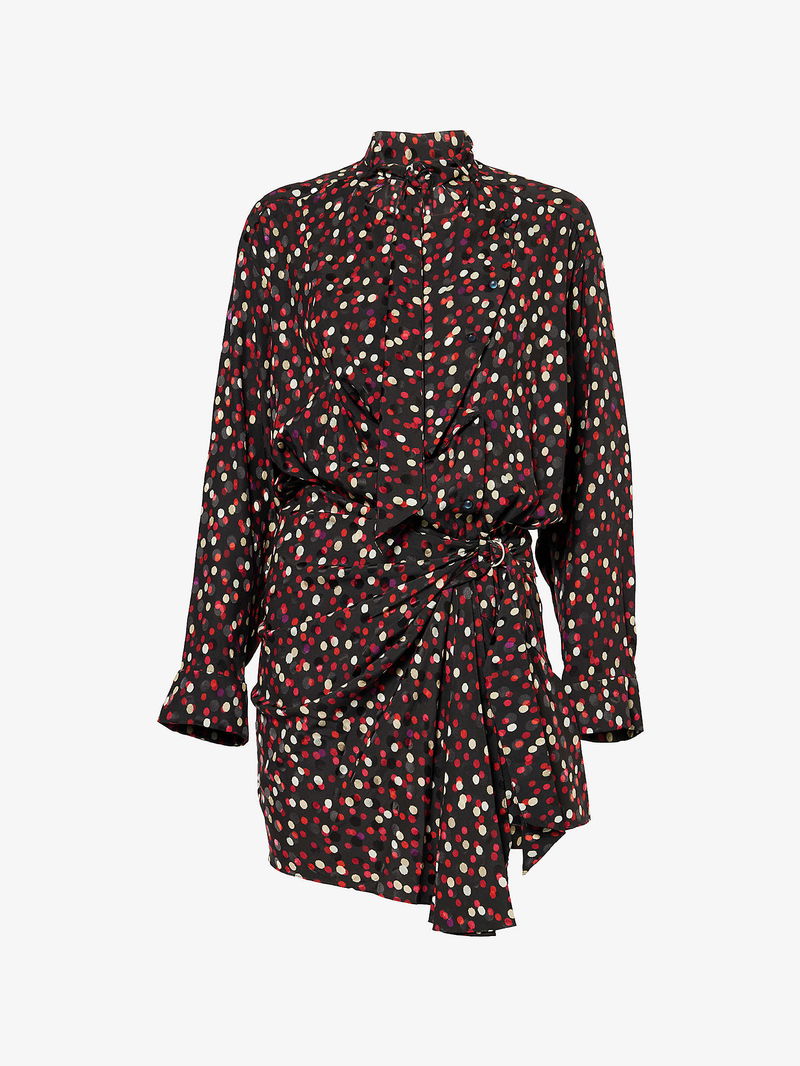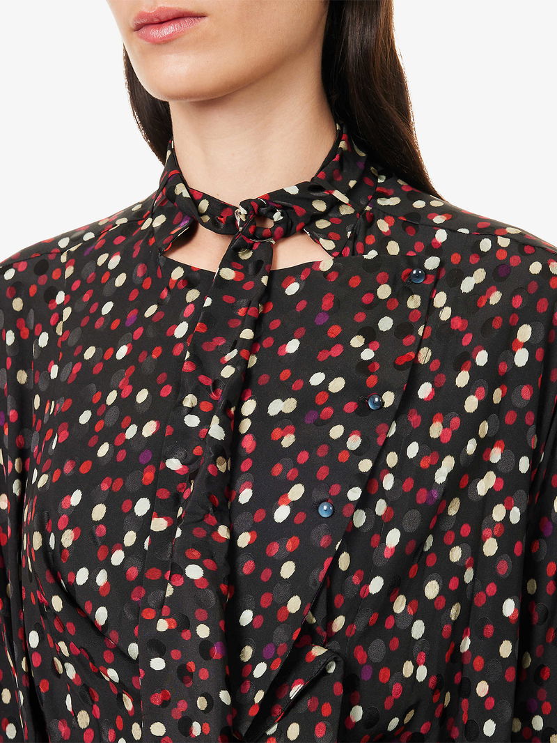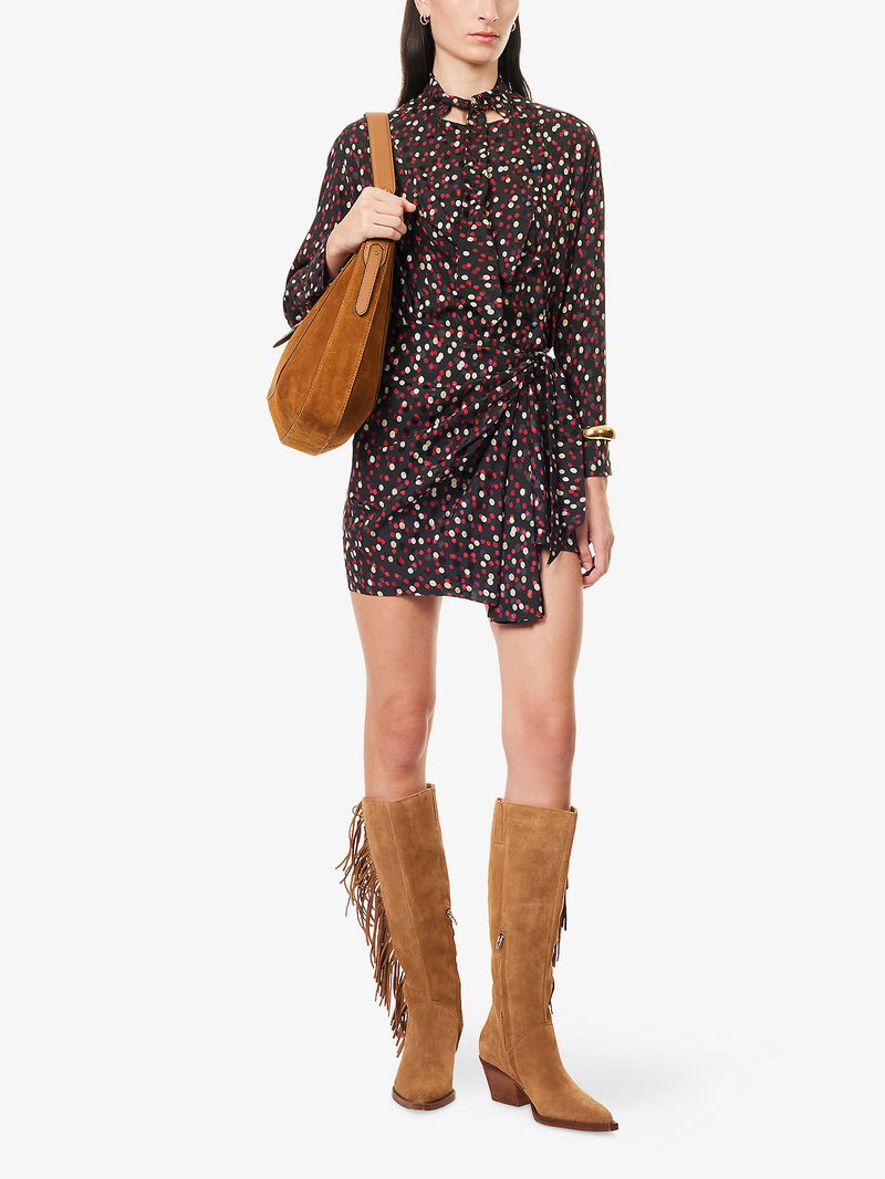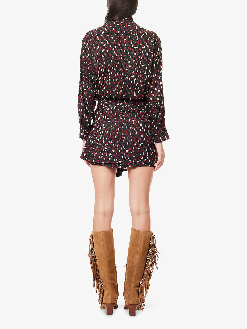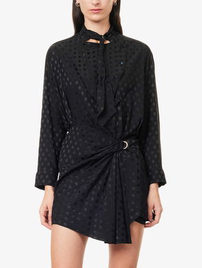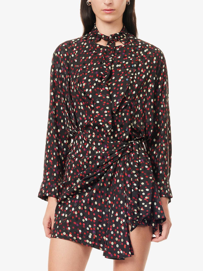 Isabel Marant silk-blend mini dress. Regular fit, high neck, long sleeves, buttoned sleeve hems, wrap-over design, polka-dot pattern.