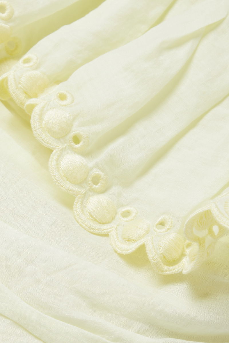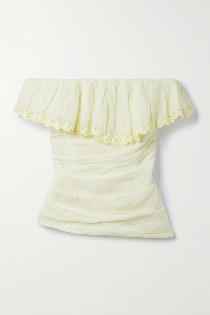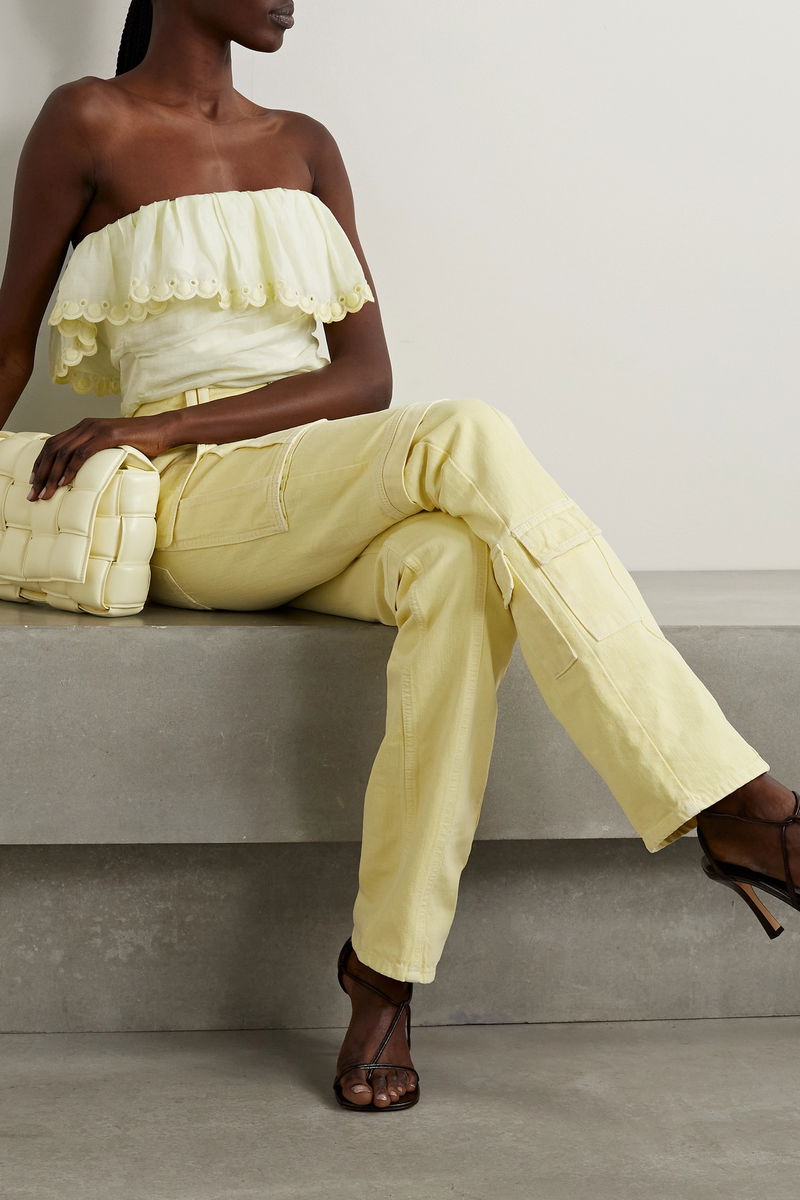 Isabel Marant's 'Orma' top has a strapless, ruffled neckline trimmed with pretty broderie anglaise. Cut from ramie in a soft pastel-yellow, it has a slim, ruched bodice and internal gumming to keep it in place. Style yours with a mini skirt or denim shorts.