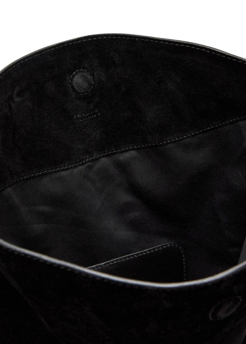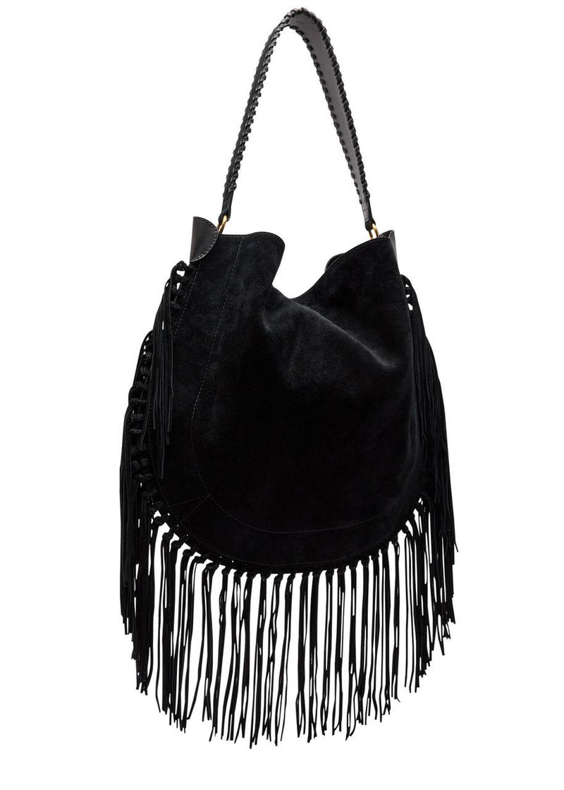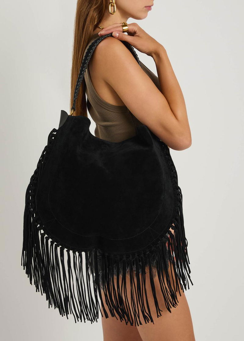 Isabel Marant suede shoulder bag. Shoulder strap with leather whipstitch trim, fringed trim, debossed logo at front, designer-engraved hardware, internal detachable leather pouch, fully lined.