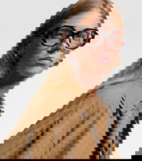 Isabel Marant’s green acetate glasses are shaped to statement round frames and set with branded lenses that can be swapped out for a personal prescription.