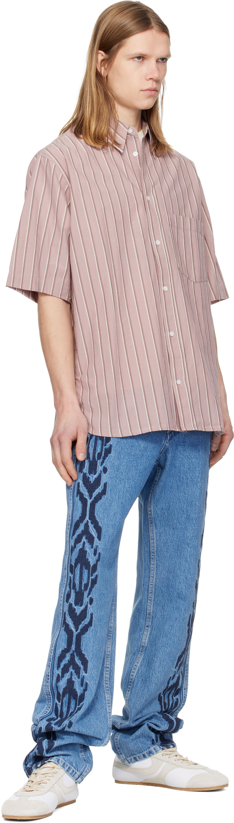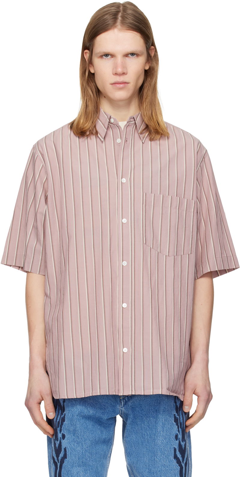 Cotton oxford cloth shirt. Stripes throughout. Spread collar. Button closure. Patch pocket at chest. Shirttail hem. Dropped shoulders. Logo embroidered at back collar. Logo-engraved hardware.