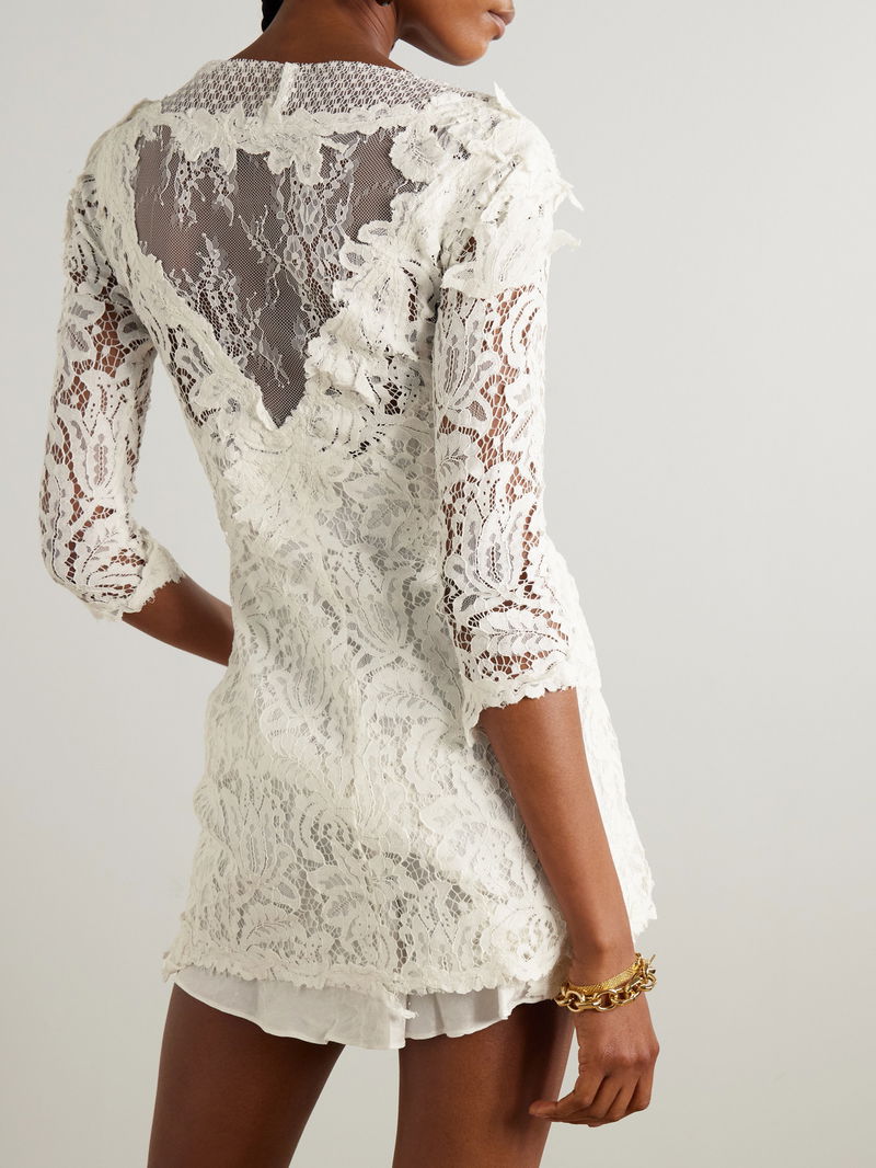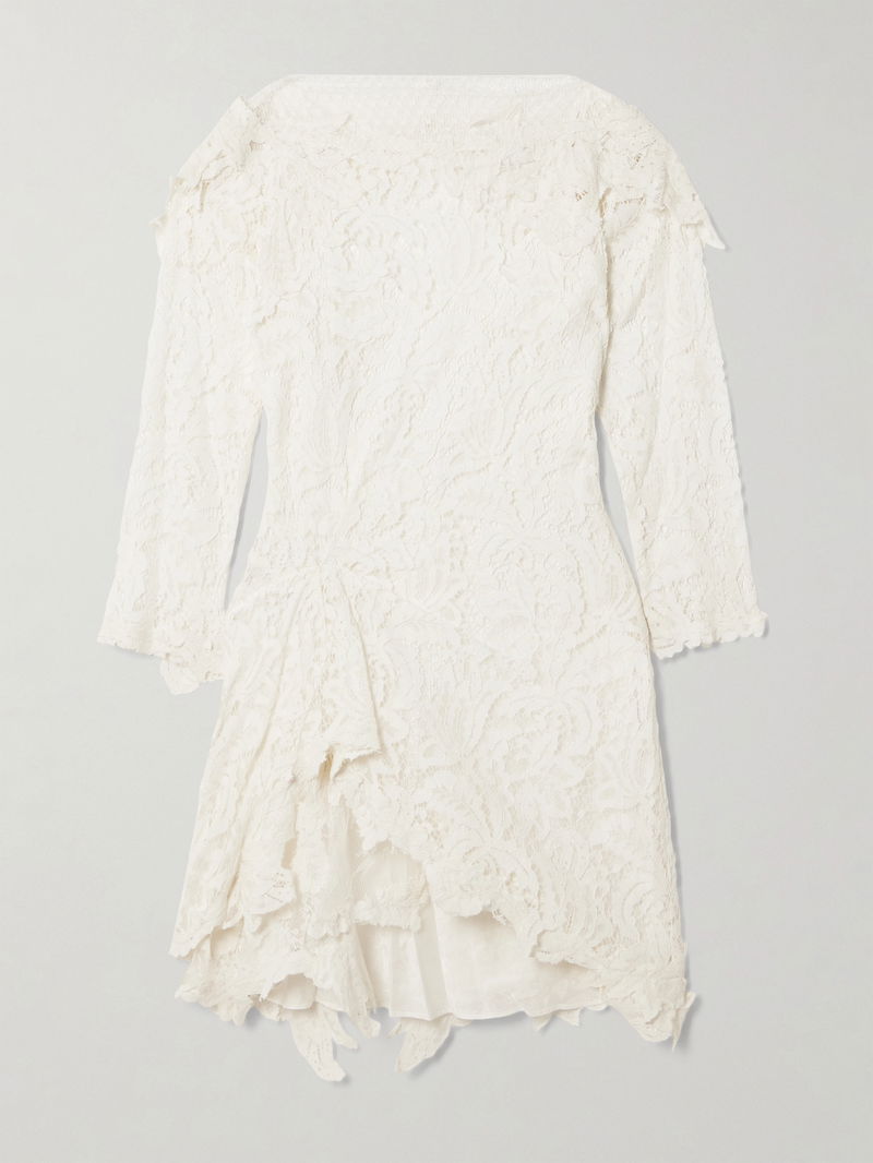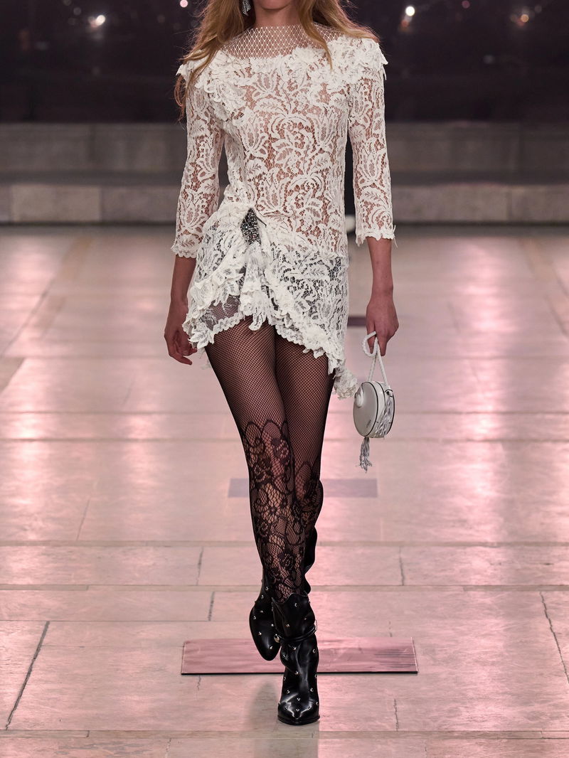Isabel Marant's Fall '25 runway was presented in the Palais Royal gardens, where models walked to electronica. Inspired by the city girl and New Wave aesthetics, the 'Rubiana' cotton-blend lace dress nods is cut with a handkerchief hem and paneled with sheer tulle along the neckline. It comes with a paisley satin-jacquard slip for coverage.