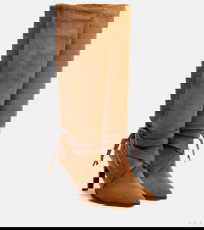Calf-high calfskin suede boots in taupe. · Pull-loops at collar· Suede lining· Stacked leather block heel· Treaded rubber sole· Contrast stitching in white·